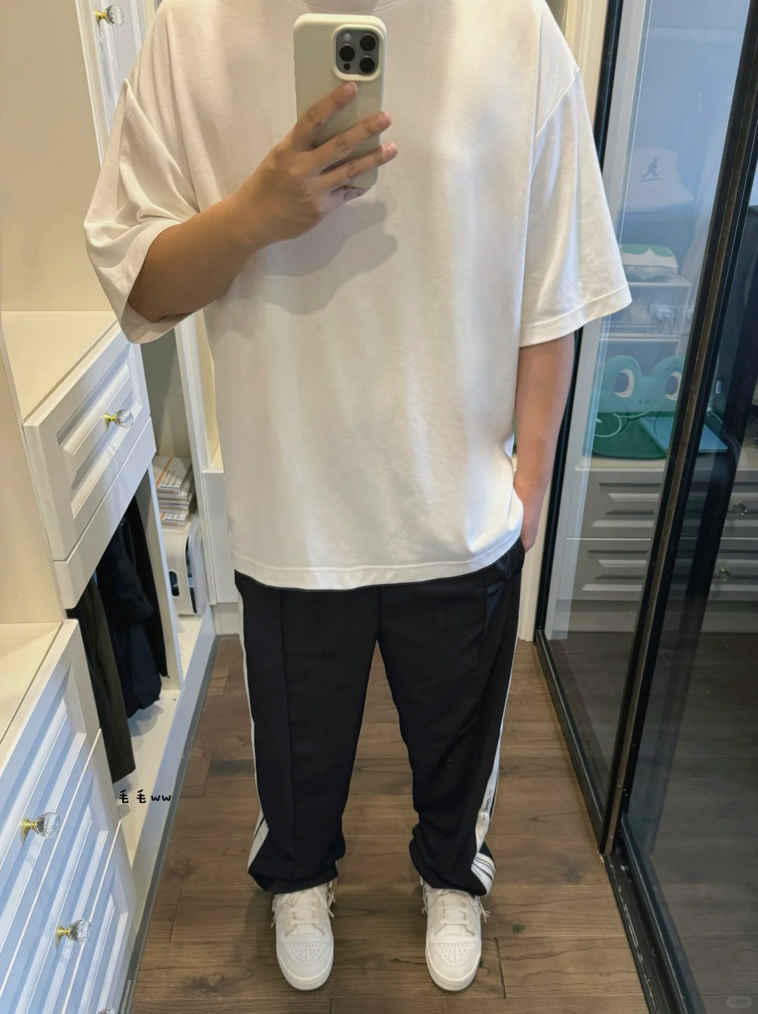 -有效的夏季穿搭,试试黑白色系,只需要简洁的白Tee搭配直筒裤即可 . -搭一双百搭的小白鞋,不会显得头重脚轻,整体白黑白的效果非常自然 . —————— . ✏️本人178cm75kg 球鞋尺码265mm(正常EU42) . 💭以上均为我个人观点,不喜勿喷,欢迎讨论。