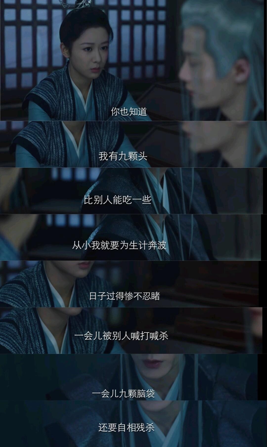 小夭在得知自己身世后在离戎老伯故居崩溃痛哭,相柳找到小夭,用自己小时候颠沛流离的生活安慰小夭,然后一本正经开起了九个脑袋的玩笑。