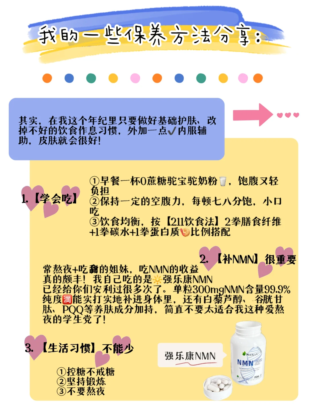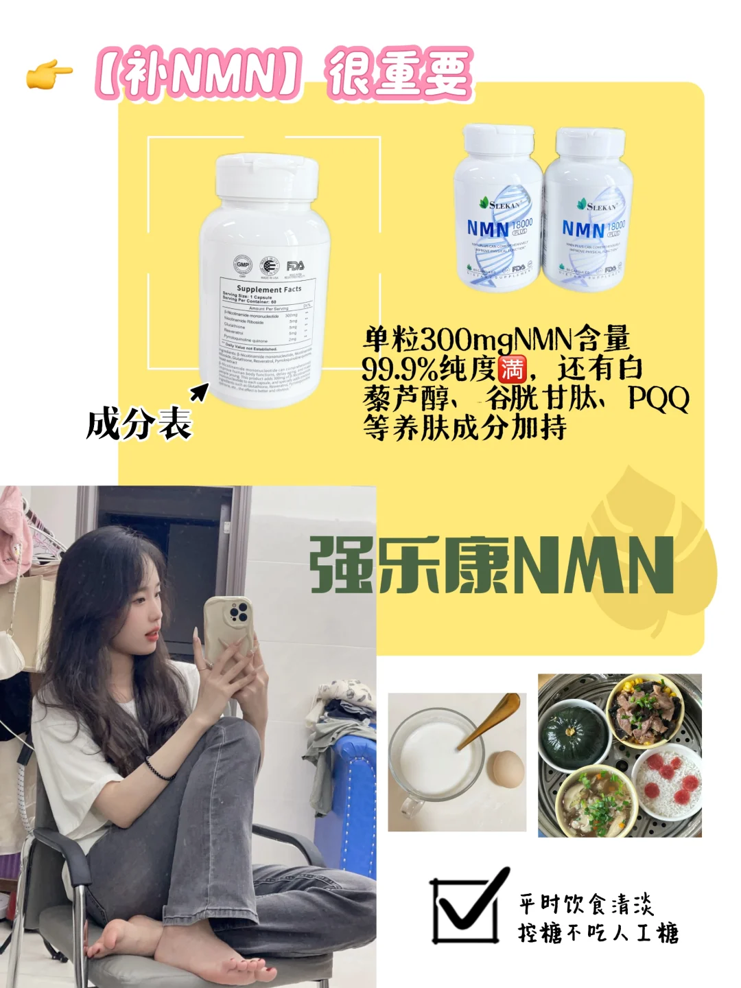 常熬夜+吃甜食的姐妹,吃NMN的收益真的颇丰!我自己吃的是🔆 强乐康NMN ,已经给你们安利过很多次了。单粒300mgNMN含量99.9%纯度🈵能实打实地补进身体里,还有白藜芦醇、谷胱甘肽、PQQ等养肤成分加持,简直不要太适合我这种爱熬夜的学生党了!