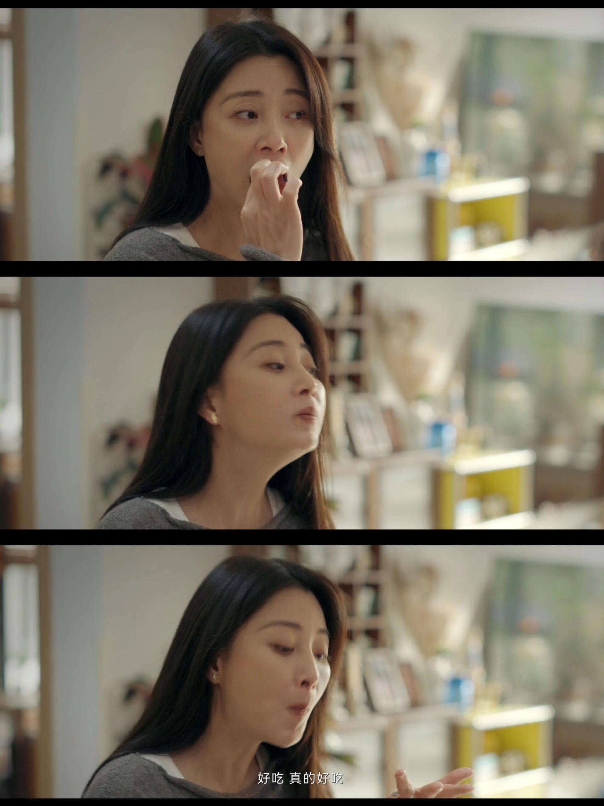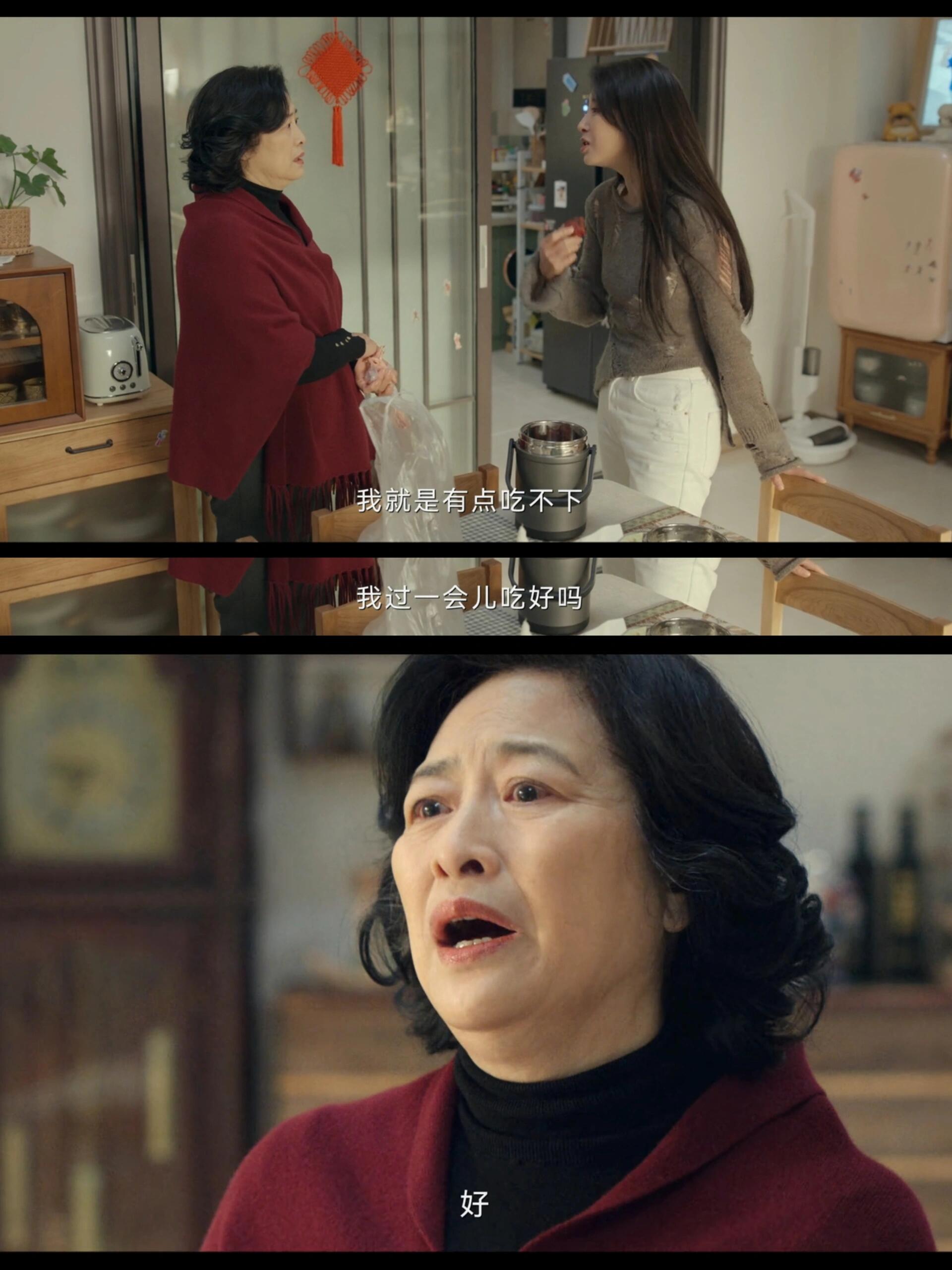 女主尝了一口说好吃,接着说自己刚吃完早饭,还不饿,等会儿再继续吃,这时候,妈妈开始细数自己做这个米糕的不容易,当女主多次表达自己“过会儿再吃好不好”之后,她红着眼眶说“好”。