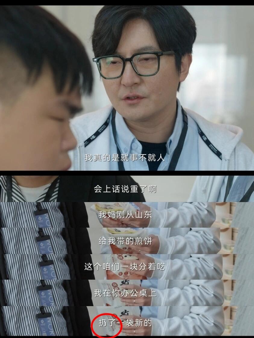 其实男主并不是没有情商,他在会上暴风输出后,也知道去跟同事道歉,而且说“扔了一袋煎饼在你桌子上”。