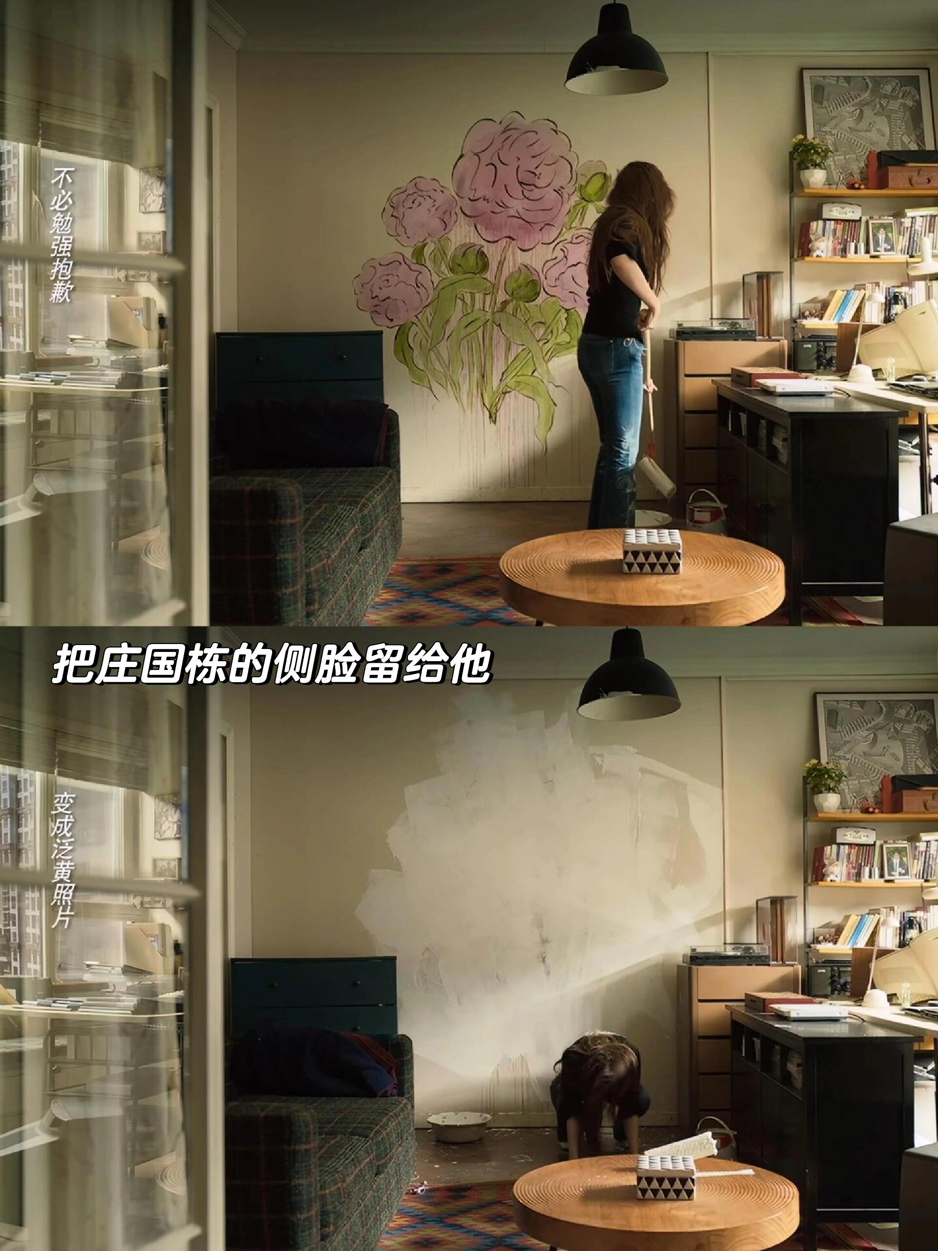 2.玫瑰在庄国栋家画了玫瑰,分手就把它刷了,结果粉刷的印迹像极了庄国栋的侧脸!可能玫瑰希望庄国栋的人生规划有玫瑰,但最后留下了庄国栋自己。