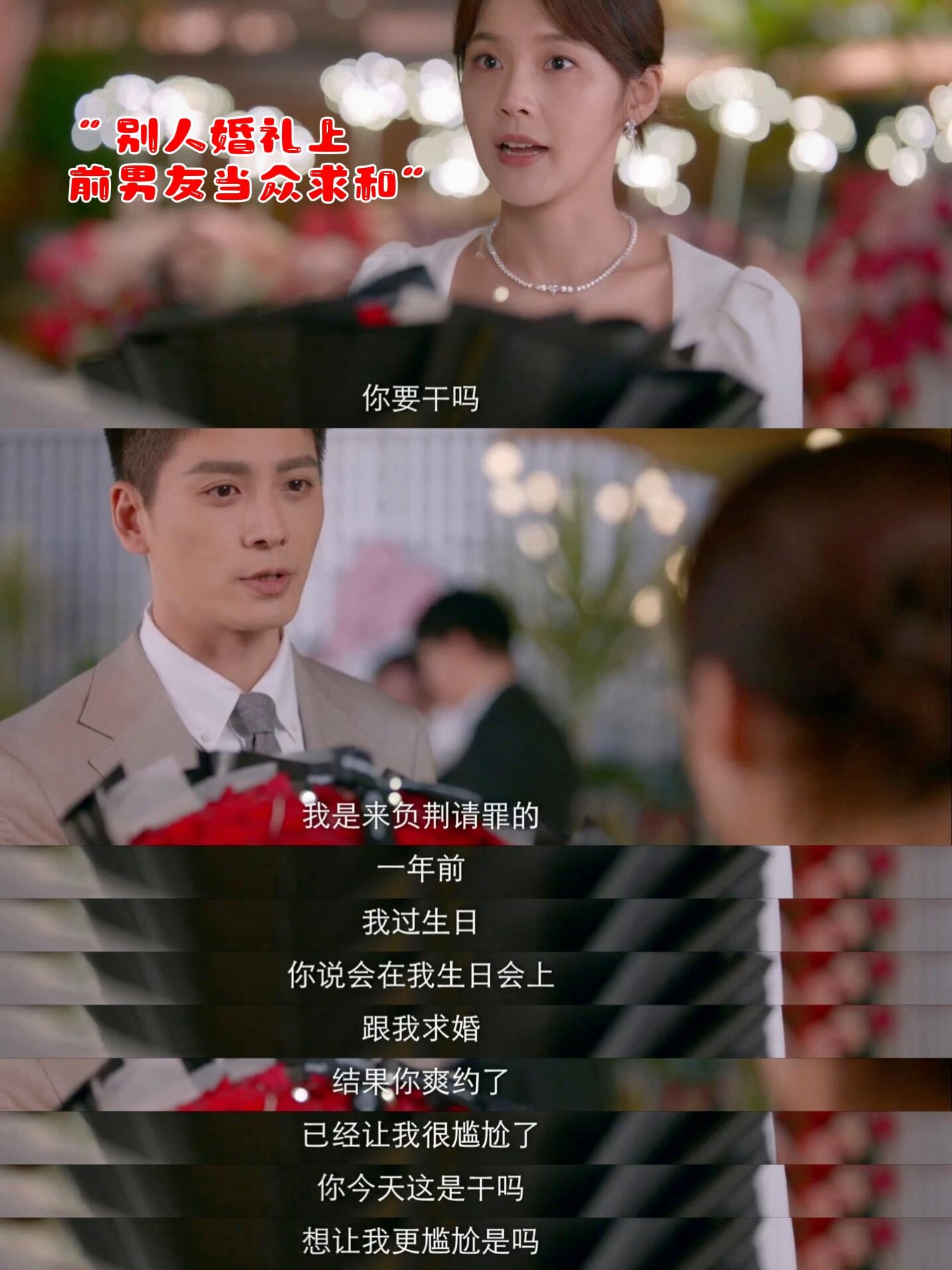 女主参加同学婚前派对,被前男友当众送花求复合,女主感到尴尬,并清醒拒绝。