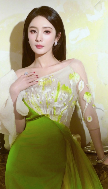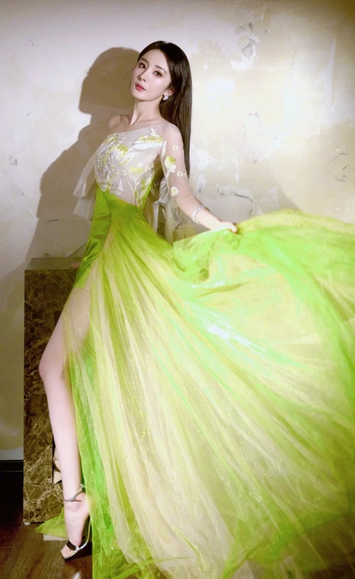 杨幂身着一件上白下绿的美丽长裙,层层叠叠的薄纱飘逸大气,整个造型气质斐然。