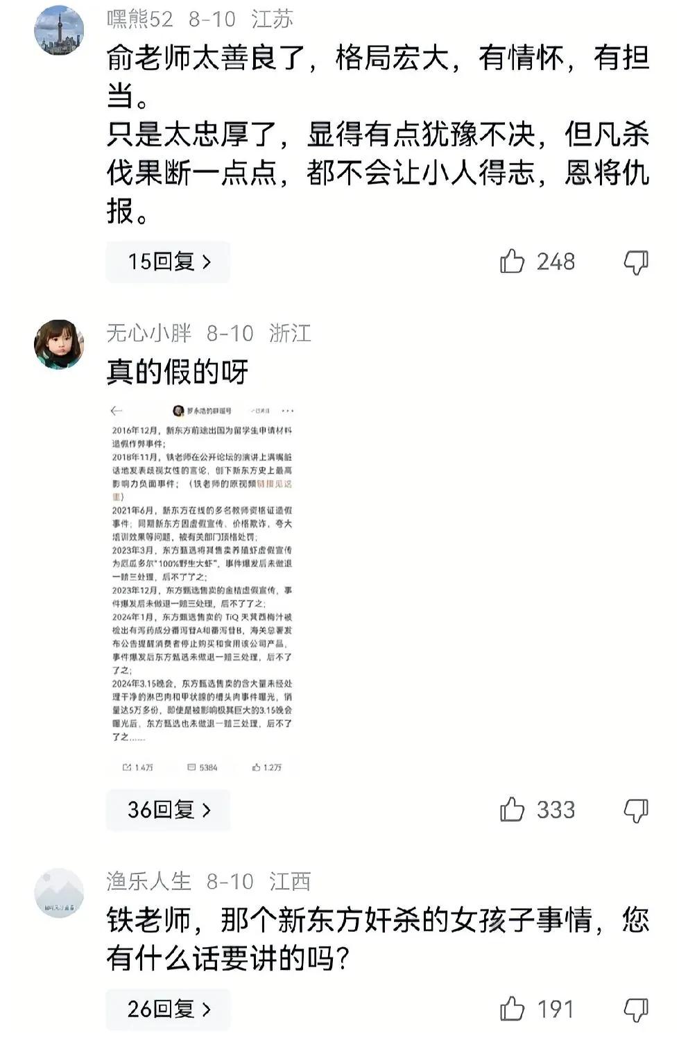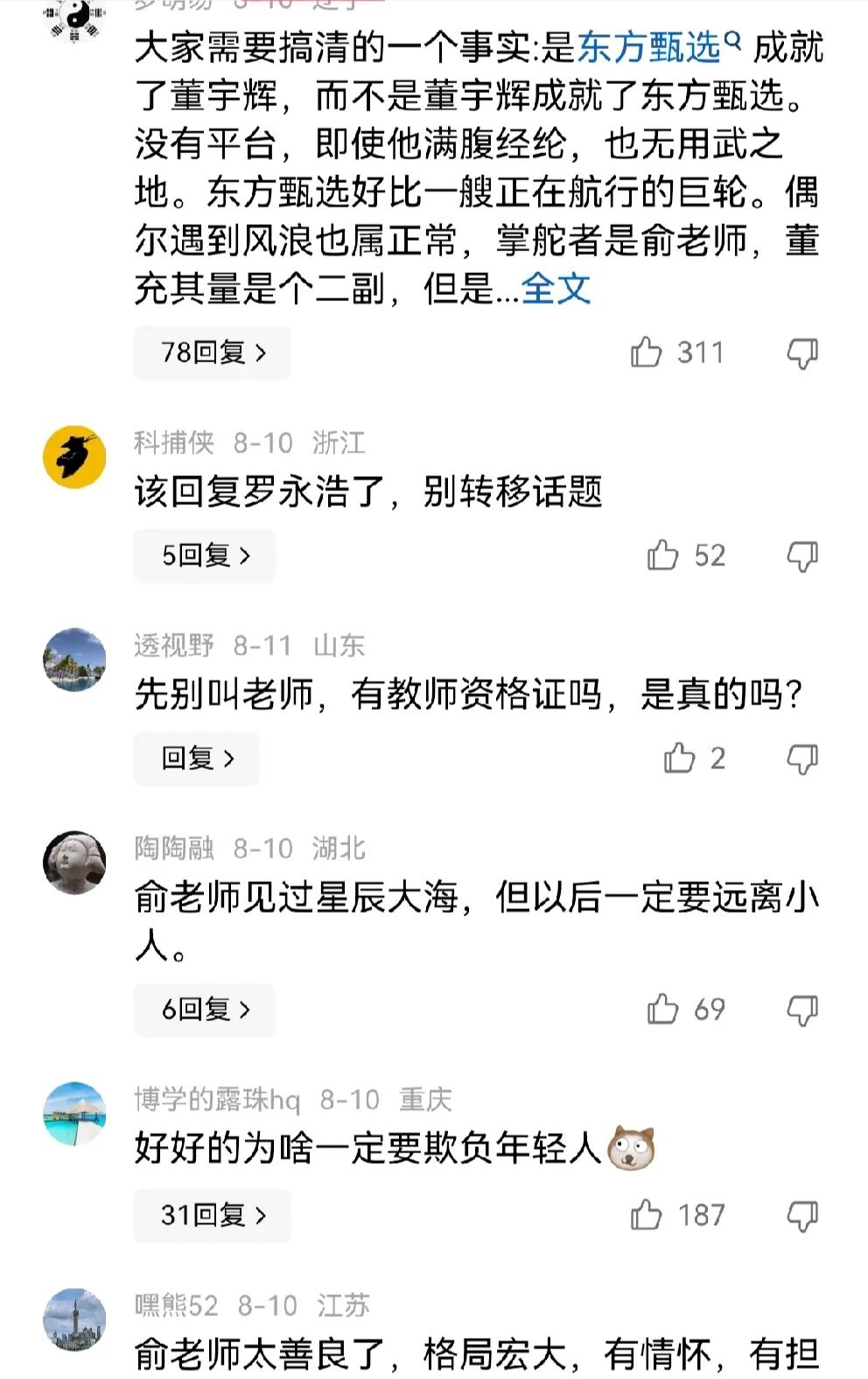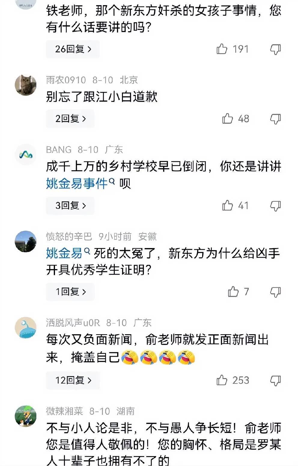 鱼老师转战头条号,重开评论区试水,两边粉丝从抖音转到头条号对喷,大部分网友根据罗永浩5000字反击信责问鱼老师,如“为何帮杀人学生写优秀学生证明?”目前没有到任何回信哈哈。。看来网友又是要逼鱼老师关评论区节奏?