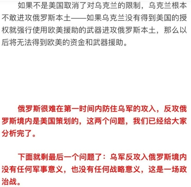 一直想不通,乌军攻入俄境内没有任何战略意义,但为啥还要牺牲一万多士兵?直到现在才恍然大悟 ,原来如此,炮灰是没有说话 的权力 的。 俄乌战争打到今天 ,相信明眼人早就看出来了, 乌克兰实际上就是一个傀儡 ,他说了话不算, 他是一个提线木偶,真正在后面提面的人是美国的民主党。 现在民主党方面因为处于劣势,所以要在俄乌战场上扳回一局,所以就让乌克兰的军人深入敌境,大家都知道这支军队就是一个炮灰 ,孤军深入,没有战略后勤支持, 这最后不是投降就是被全体坑杀,实在是没有第三条路可走。 但是只要民主党在选举上击败共和党, 别说牺牲万八千的乌克兰士兵,就是十倍的代价他们照样不眨眼睛 ,反正死道友不死贫道。