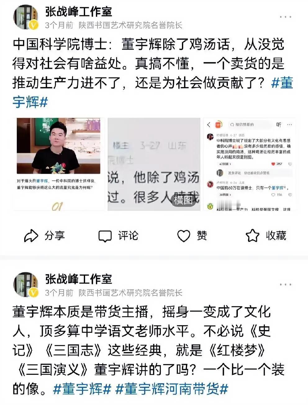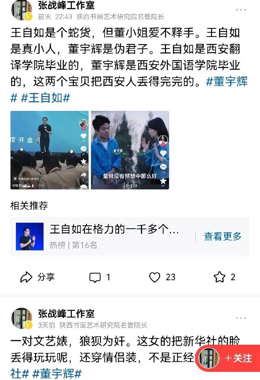 张战峰是个什么人?还是陕西书画艺术研究院长?看庐山烟雨出名了,也天天发帖子黑宇辉,攻击丈母娘,还黑新华社?这个渣比庐山烟雨还不如,庐山烟雨有时还似还有理有据,这货直接粗言秽语?这也不投诉@董宇辉 法务要行动。不干活尽是装象?