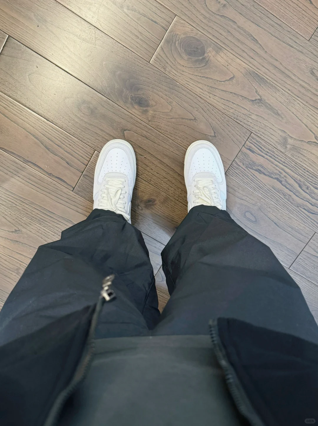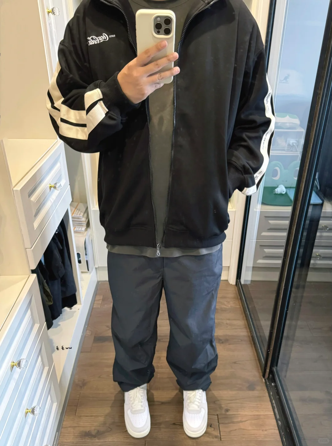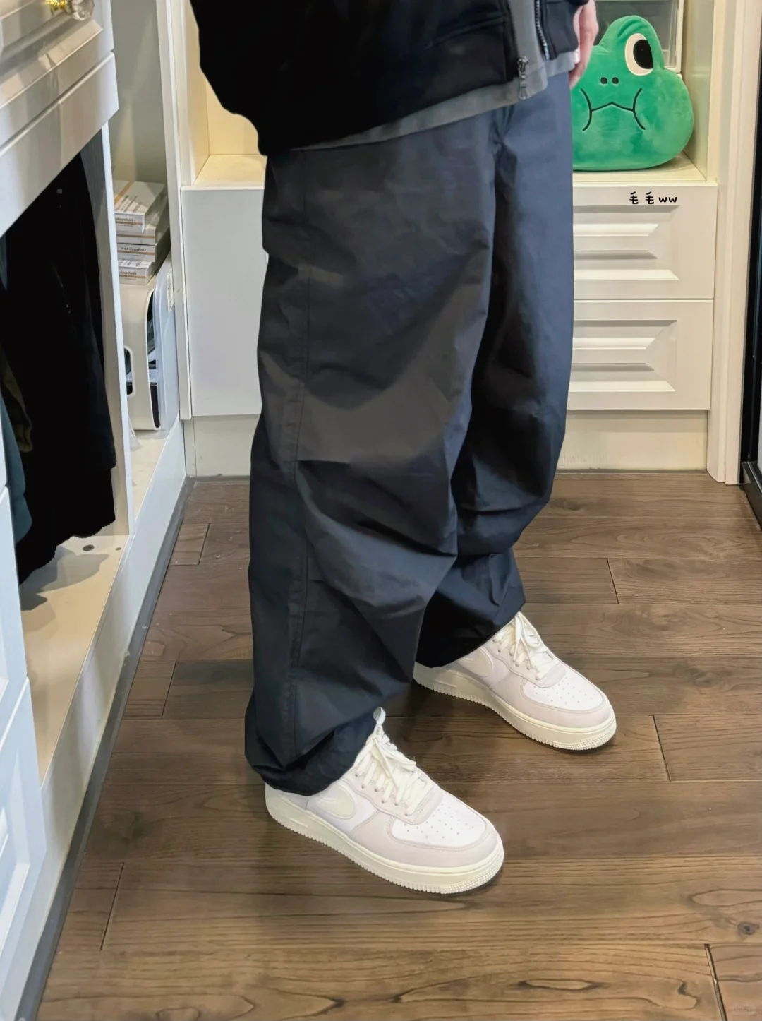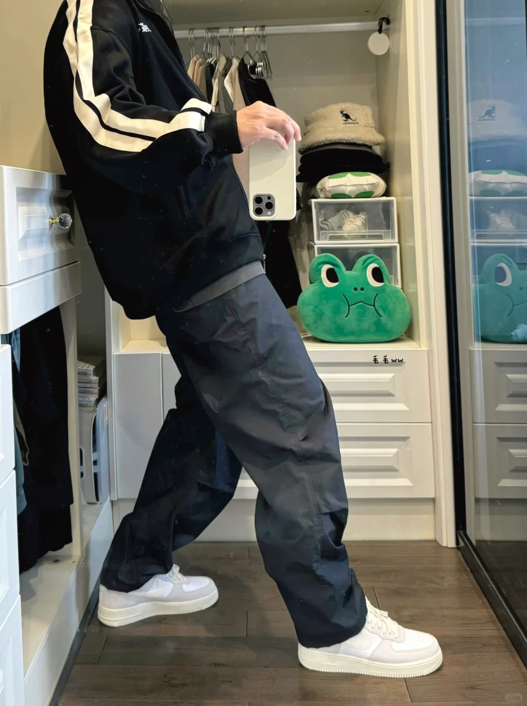 -降落伞裤,去年火了一阵,个人也偏爱这种锥子版型,AF1或Dunk low都匹配 . -宽松廓形的外套,比合身的更适合伞裤,随便踩双小白鞋,整体效果就很舒服 . —————— . ✏️本人178cm75kg 球鞋尺码265mm(正常EU42) . 💭以上均为我个人观点,不喜勿喷,欢迎讨论。