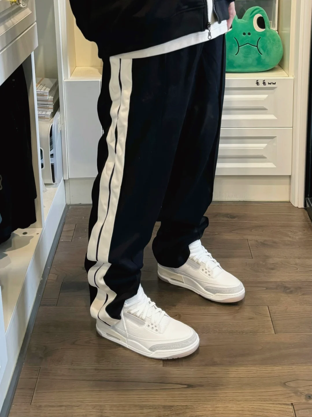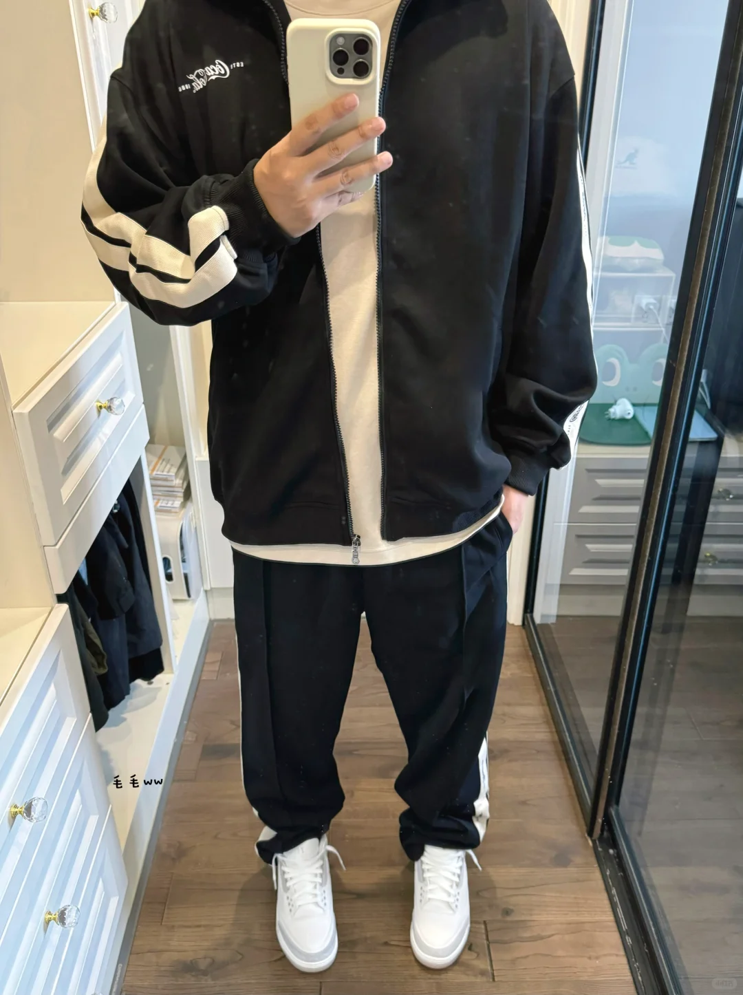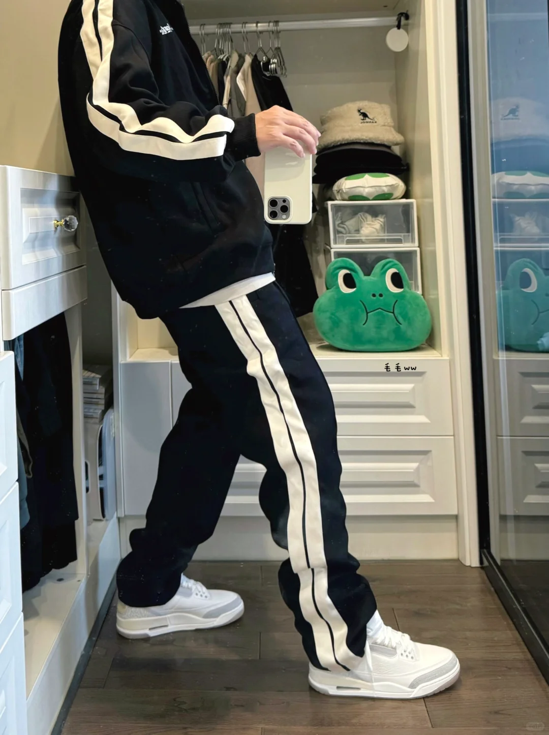-侧条纹的“校服”套装也曾风靡一时,主打舒适度,不用过多考虑搭配,容易被大众接受 . -整体黑白配色,黑体白条是耐看的组合,内搭球鞋延用白色系,简洁清爽应该没人会拒绝 . —————— . ✏️本人178cm75kg 球鞋尺码265mm(正常EU42) . 💭以上均为我个人观点,不喜勿喷,欢迎讨论。