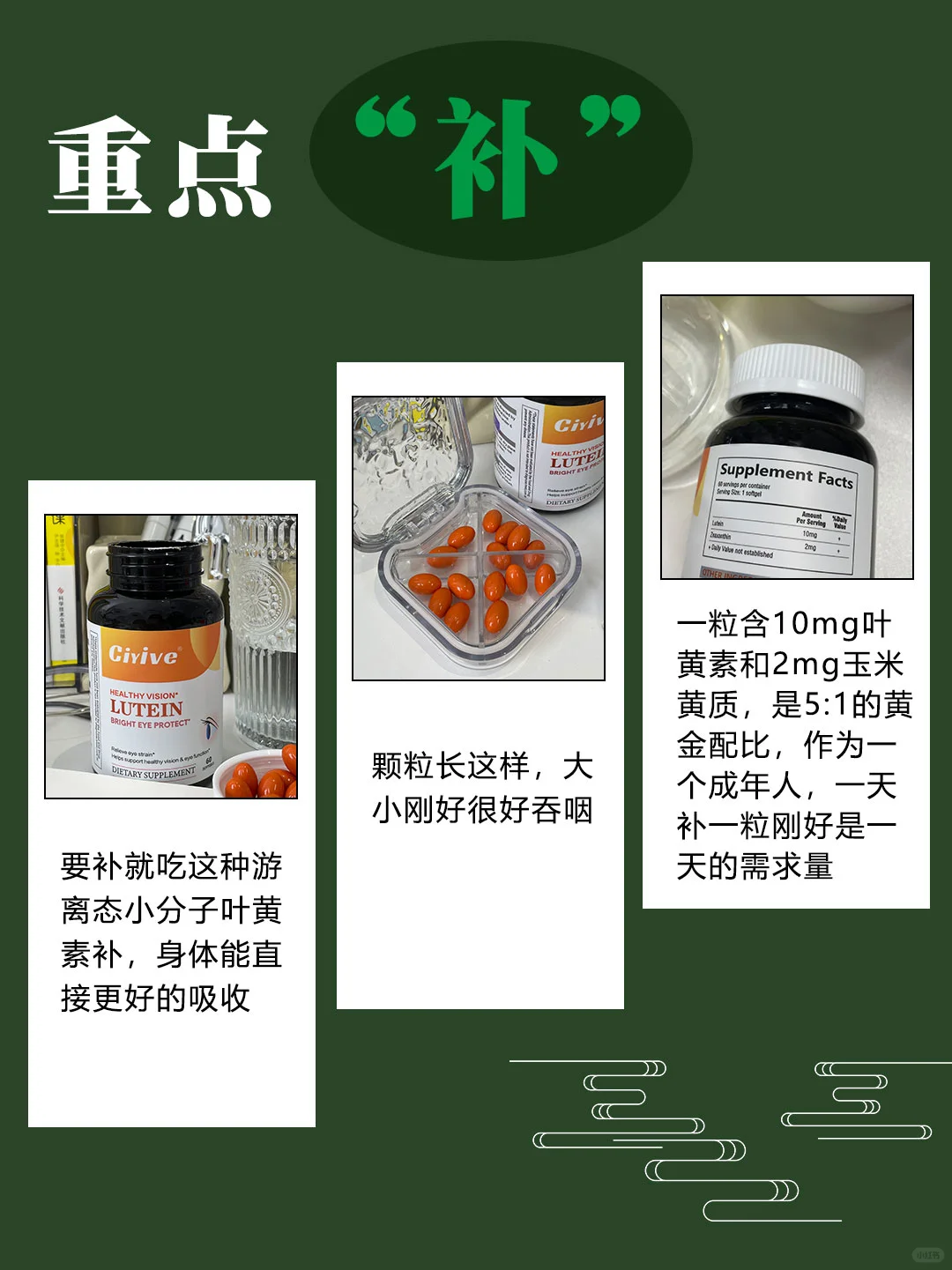 而且我做了功课,专门挑的游离态小分子叶黄素,这样身体能直接更好的吸收,含量和成分也是5:1的黄金配比,一粒含10mg叶黄素和2mg玉米黄质,没有复杂的步骤也不挑时间,随时随地都能打卡~