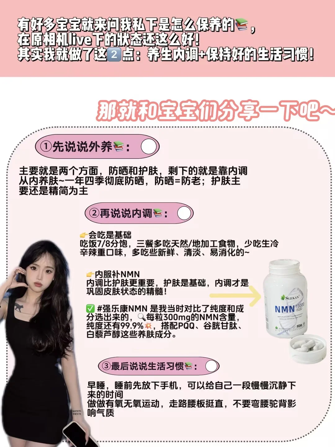 ✨每次发照片不需要用力的浓妆艳抹就有种自然的的氧气感~有好多宝宝就来问我私下是怎么保养的📚,在原相机live下的状态还这么好!其实我就做了这2⃣点:养生内调+保持好的生活习惯!