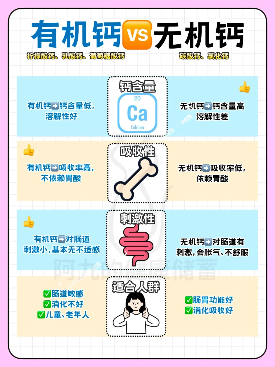 钙补剂分为有机钙和无机钙,相对来说有机钙更容易被吸收,温和不刺激肠胃。