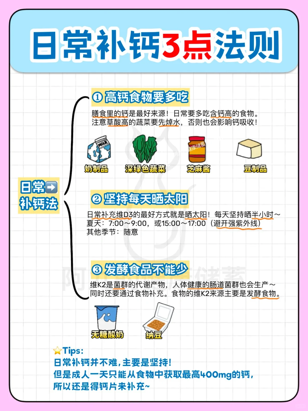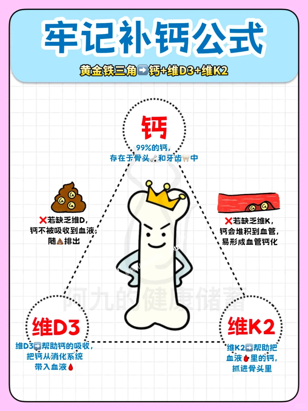 另外补钙不能单单补钙元素,还要补充VD3和VK2,层层辅助把钙补到位。