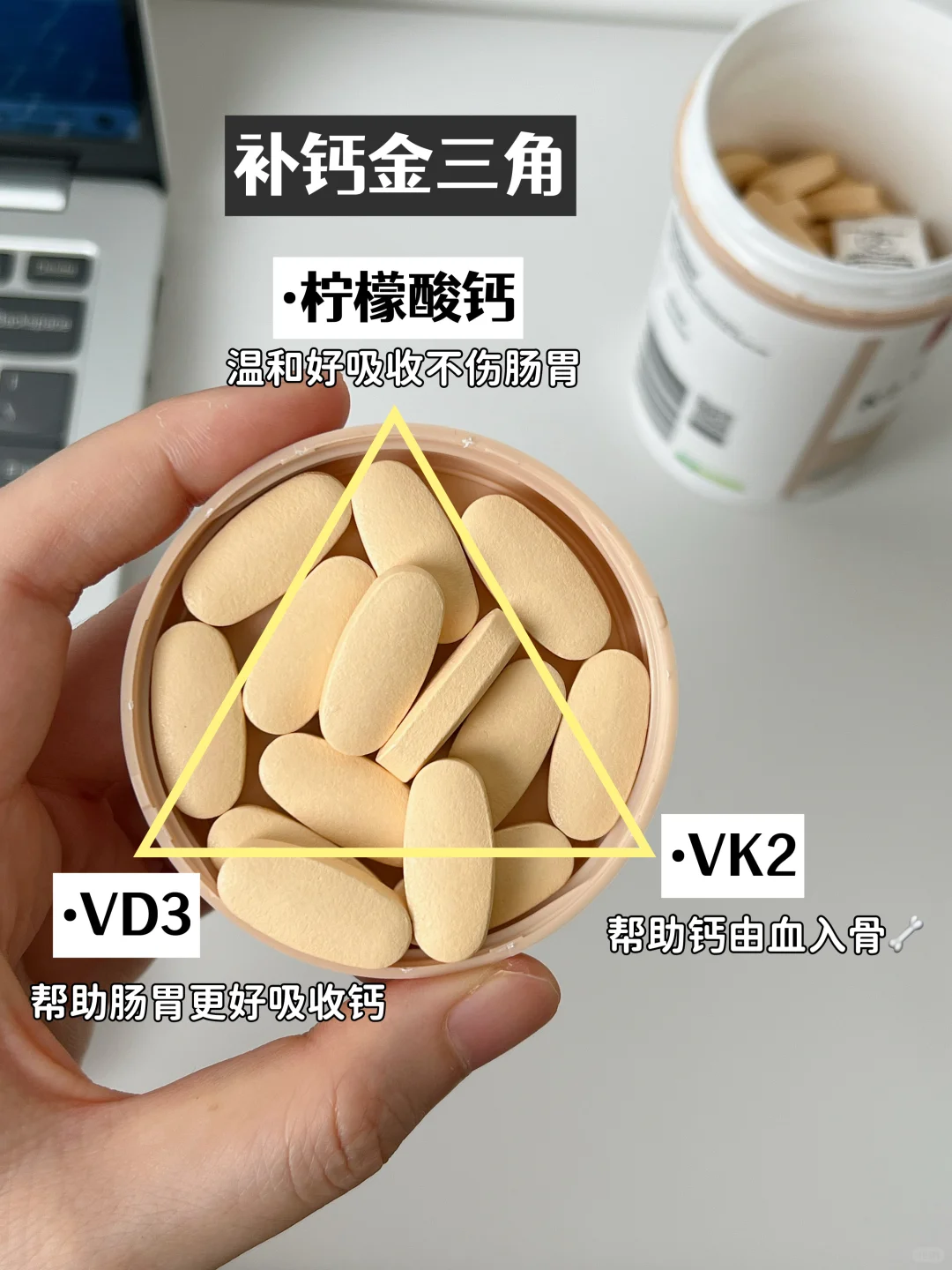 柠檬酸钙+VK2+VD3,好钙源+好辅助,补钙金三角协同助力,就是要高效的把钙补到骨子里[派对R]。