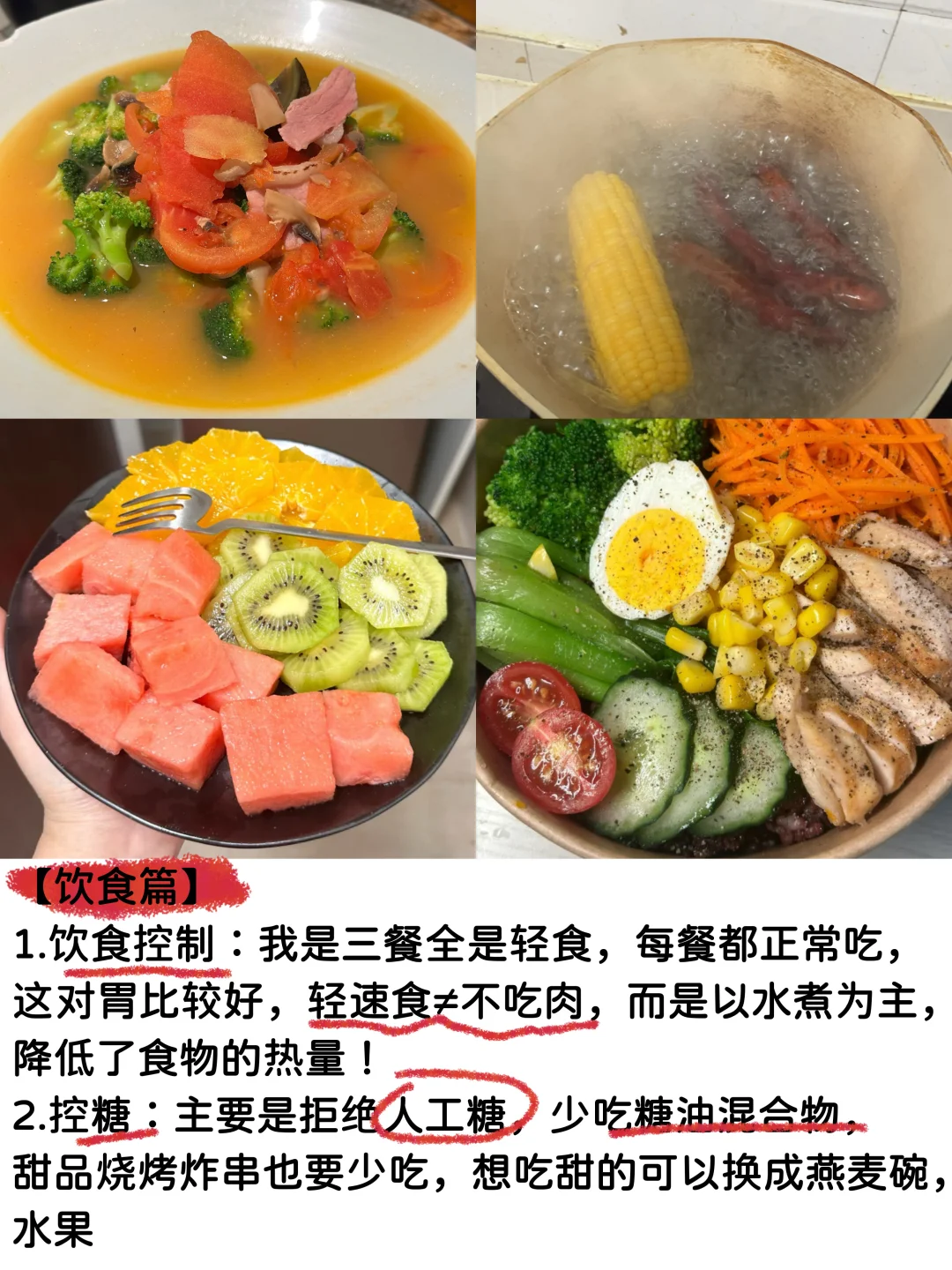 1️⃣饮食控制:管住嘴真的太重要了,我是三餐全是轻食,每餐都正常吃,这样对胃比较好,轻速食≠不吃肉,而是以水煮为主,降低了食物的热量!