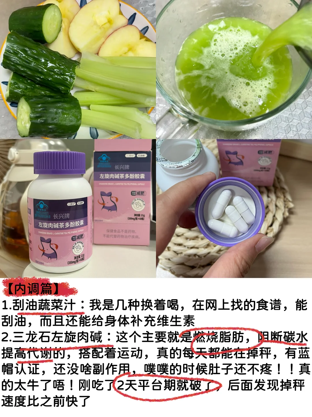2️⃣三龙石左旋肉碱:130的时候平台期,卡了很久,差一点就想放弃了,后来做了很多功课,开始内调,吃这个✅三龙石左旋肉碱(真的帮我很多),这个主要就是🟢燃烧脂肪,🟢阻断碳水,🟢提高代谢的,搭配着运动,真的每天都能在掉秤,有🍃蓝帽认证,还没啥副作用,噗噗的时候肚子还不疼!!真的太牛了唔!刚吃了2天平台期就破了,后面发现掉秤速度比之前快了,就一直再回购,现在就算吃放纵餐也不害怕!