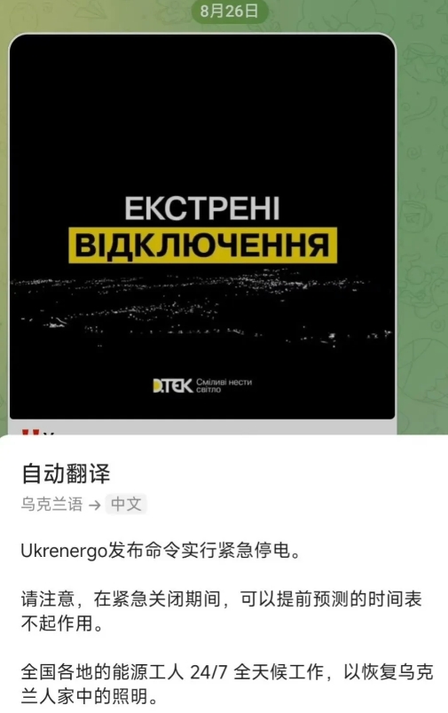 乌克兰国家能源公司宣布进行紧急停电以免造成更大损失。