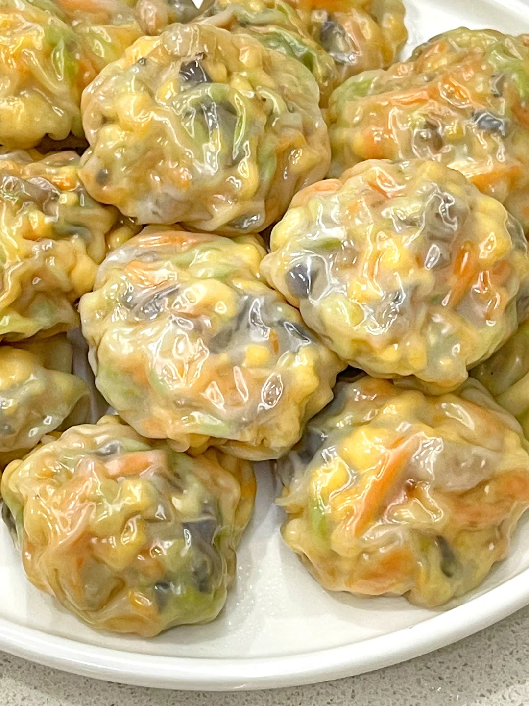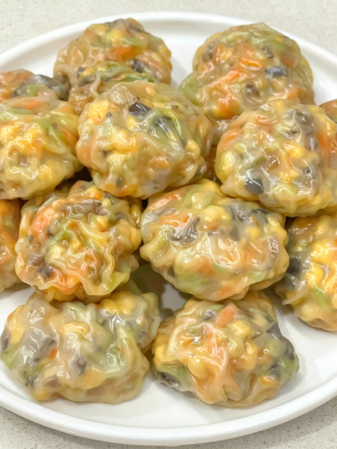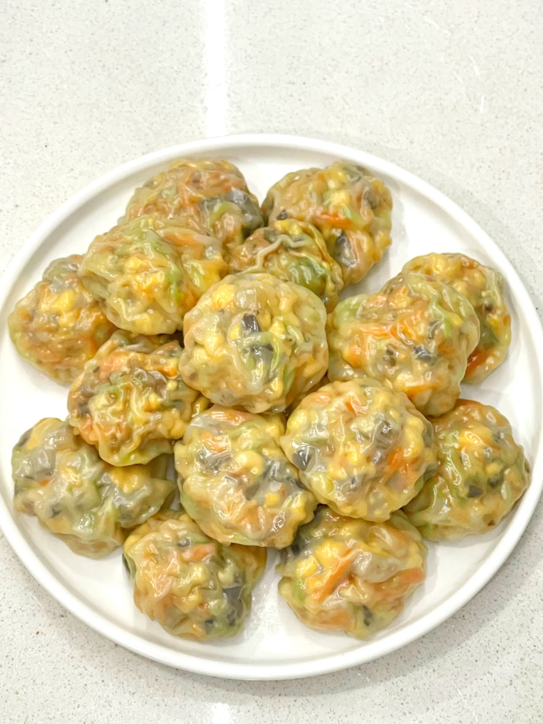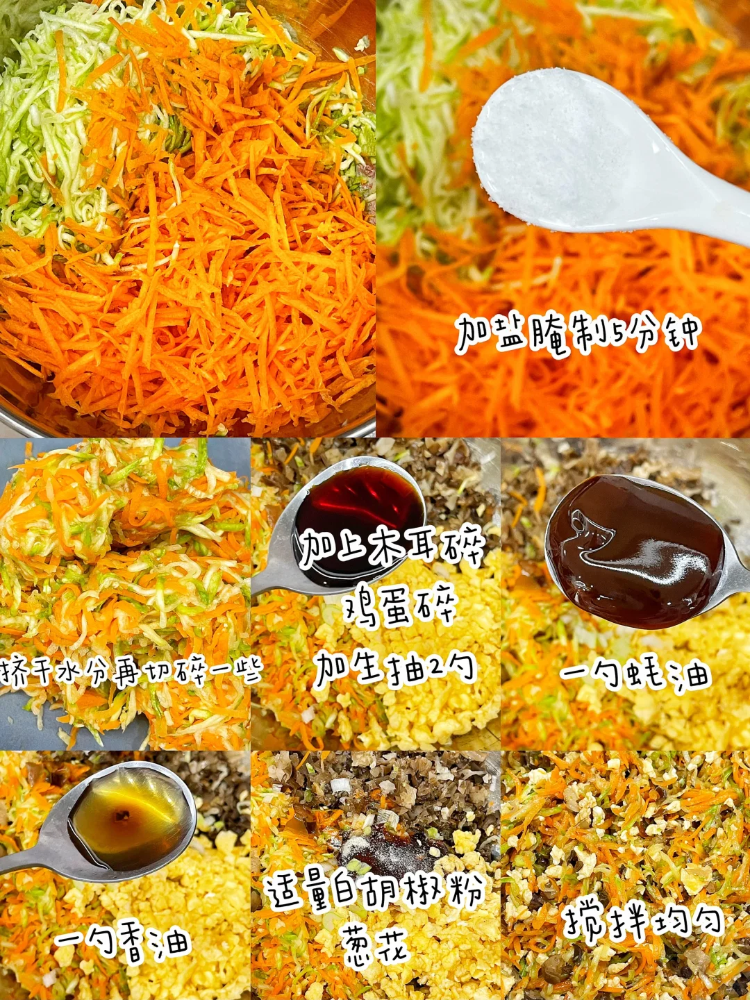 不需要揉面,也能做出好吃的蒸包,分享一个馄饨皮版的。当然。用饺子皮也是可以说. ✅准备食材:角瓜、胡萝卜、木耳、鸡蛋 ✅制作方法 🔹鸡蛋炒熟备用. 🔹木耳泡发好切碎. 🔹角瓜和胡萝卜擦丝,加盐腌制出水,挤干水分。再切碎一些. 🔹所有食材混合,加2勺生抽、一勺蚝油、适量葱花、白胡椒粉,香油搅拌均匀,馅儿料就调好了. 🔹馄饨皮包馅儿料。用包包子的手法包成小包子。收口朝下,放入蒸锅,水开10分钟即可.
