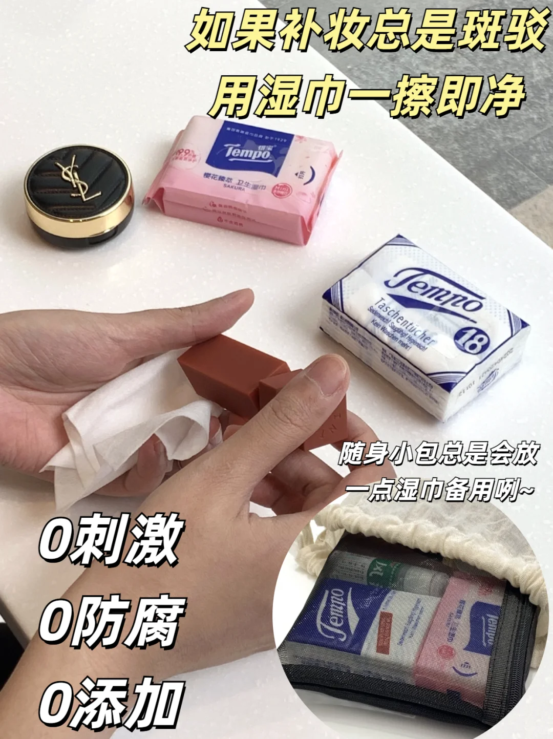 像我平常出门就会带上一两包湿巾,方便用于除汗又不留味,偶尔脱妆也能用来擦掉再进行补妆,擦拭完之后仍会有一些留香,这也是我选择得宝的原因~真的很难拒绝樱花香!!!