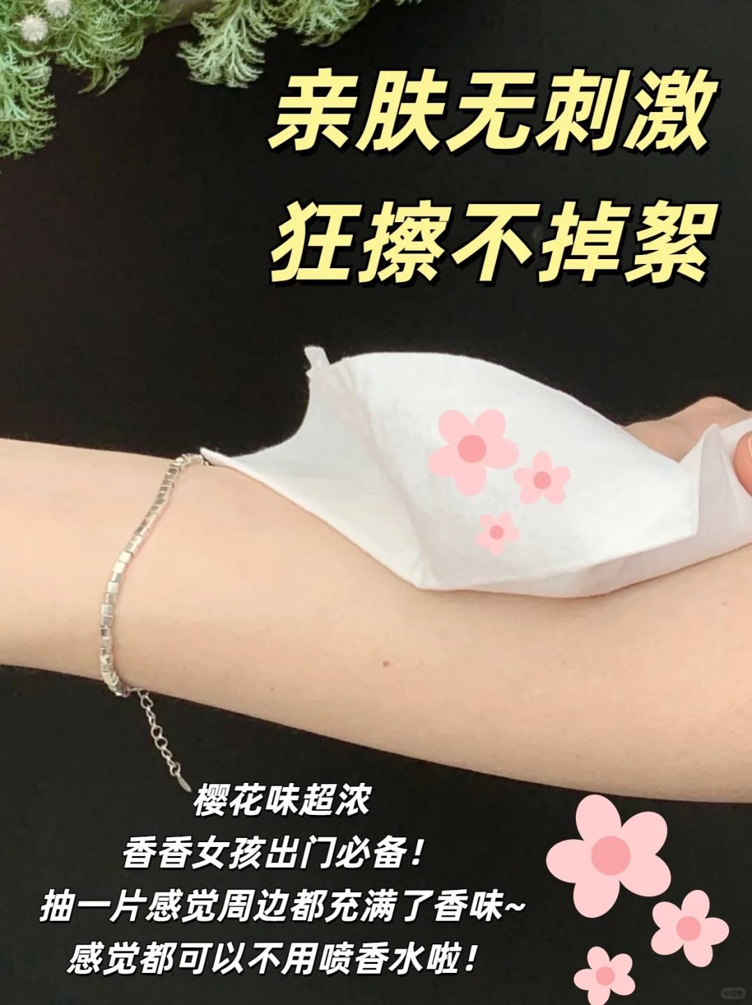 每次使用完肌肤嫩滑的程度摸起来都直呼过瘾(哈哈哈!)这款樱花湿巾真的就是高级淡雅的伪体香吧~花香的优雅中和了后调的茶香,多了一点点清冷质感好闻也很自然~感觉用的时候樱花树就在旁边一样,能够更加身临其境去感受味道~