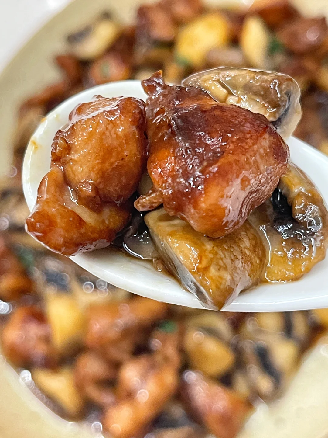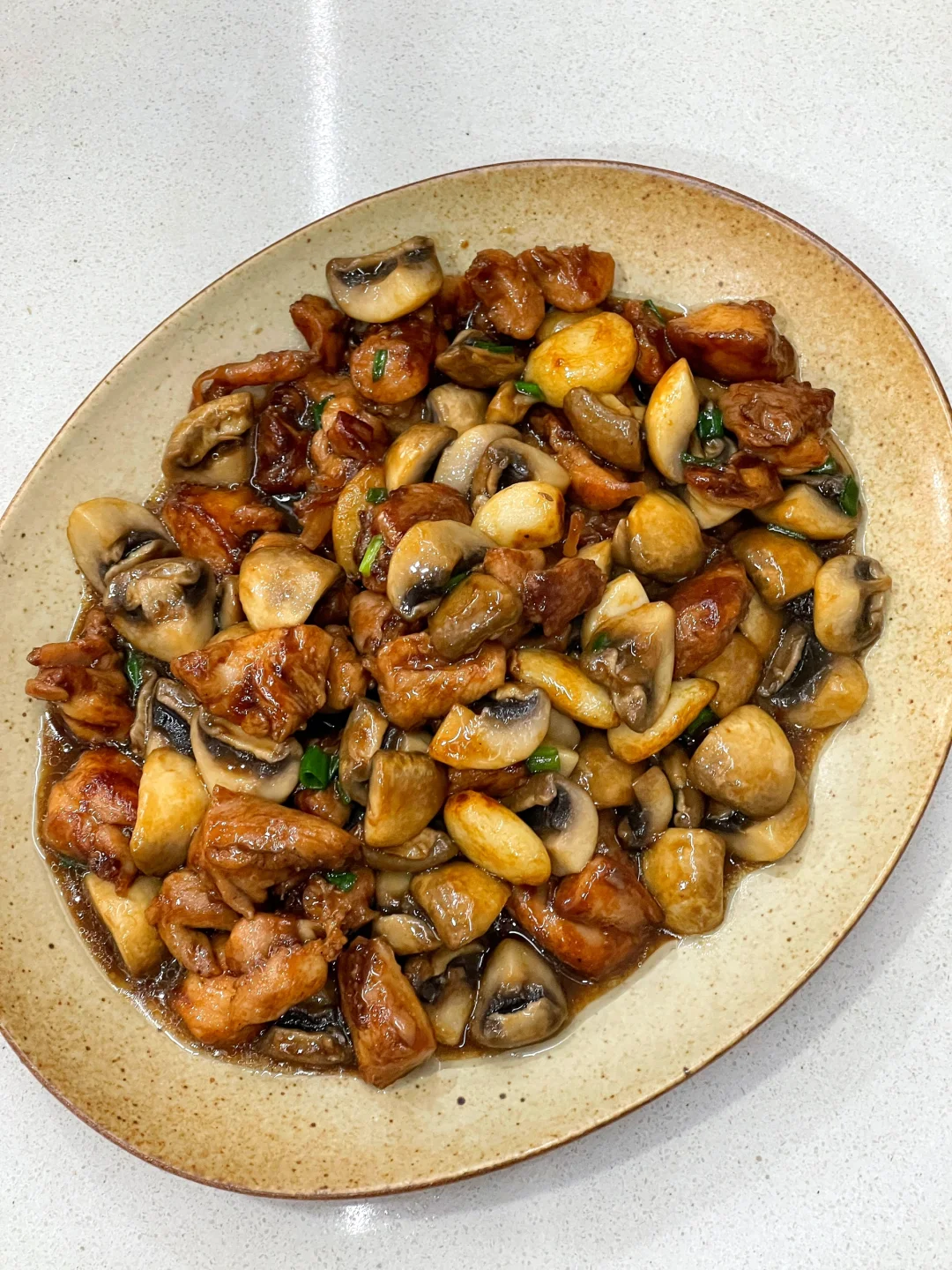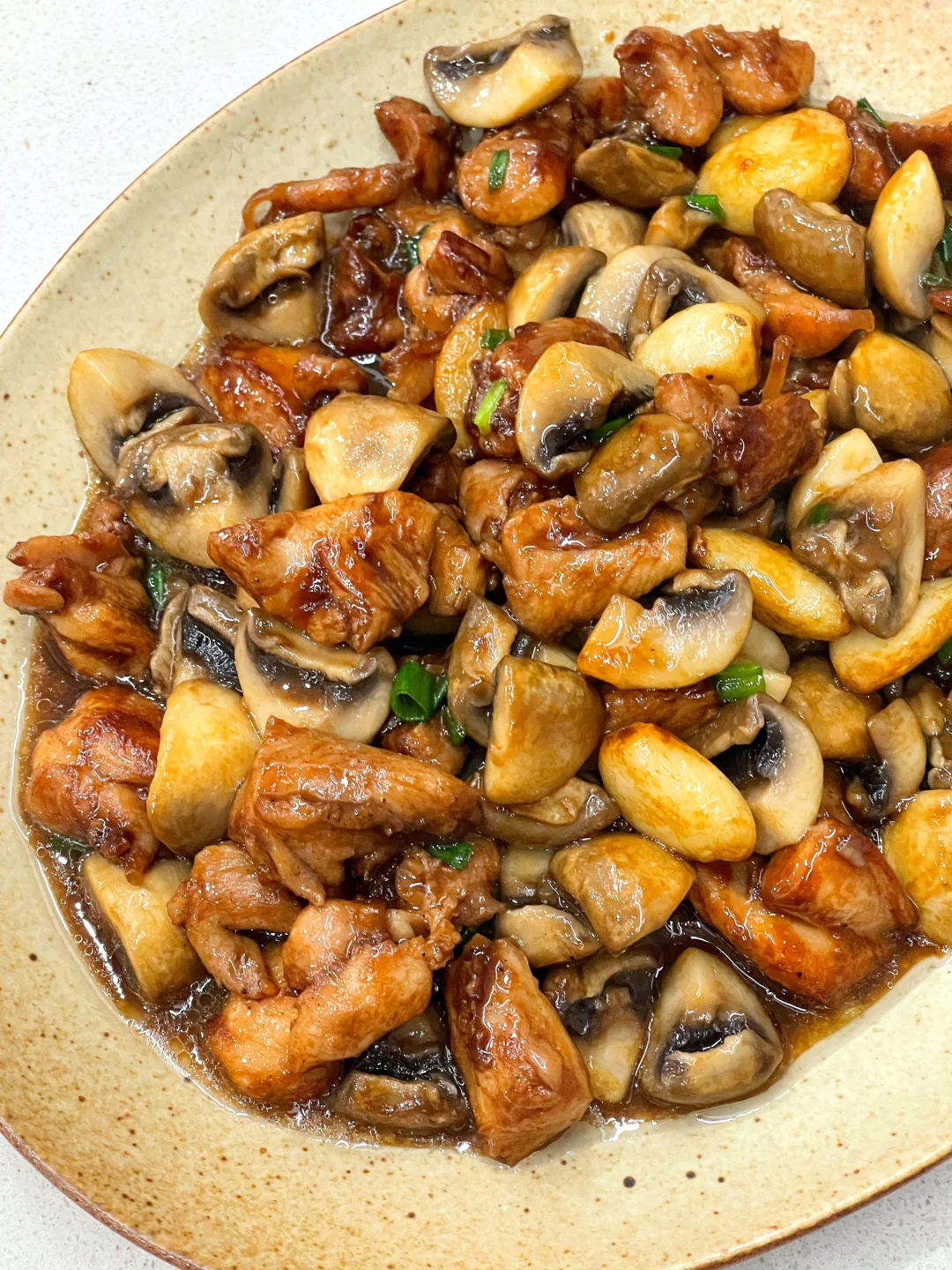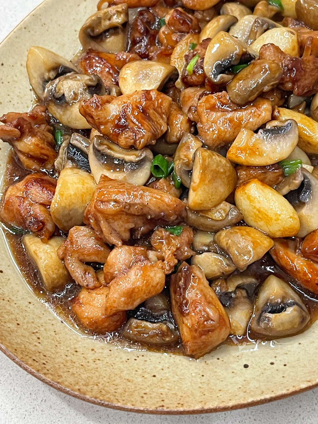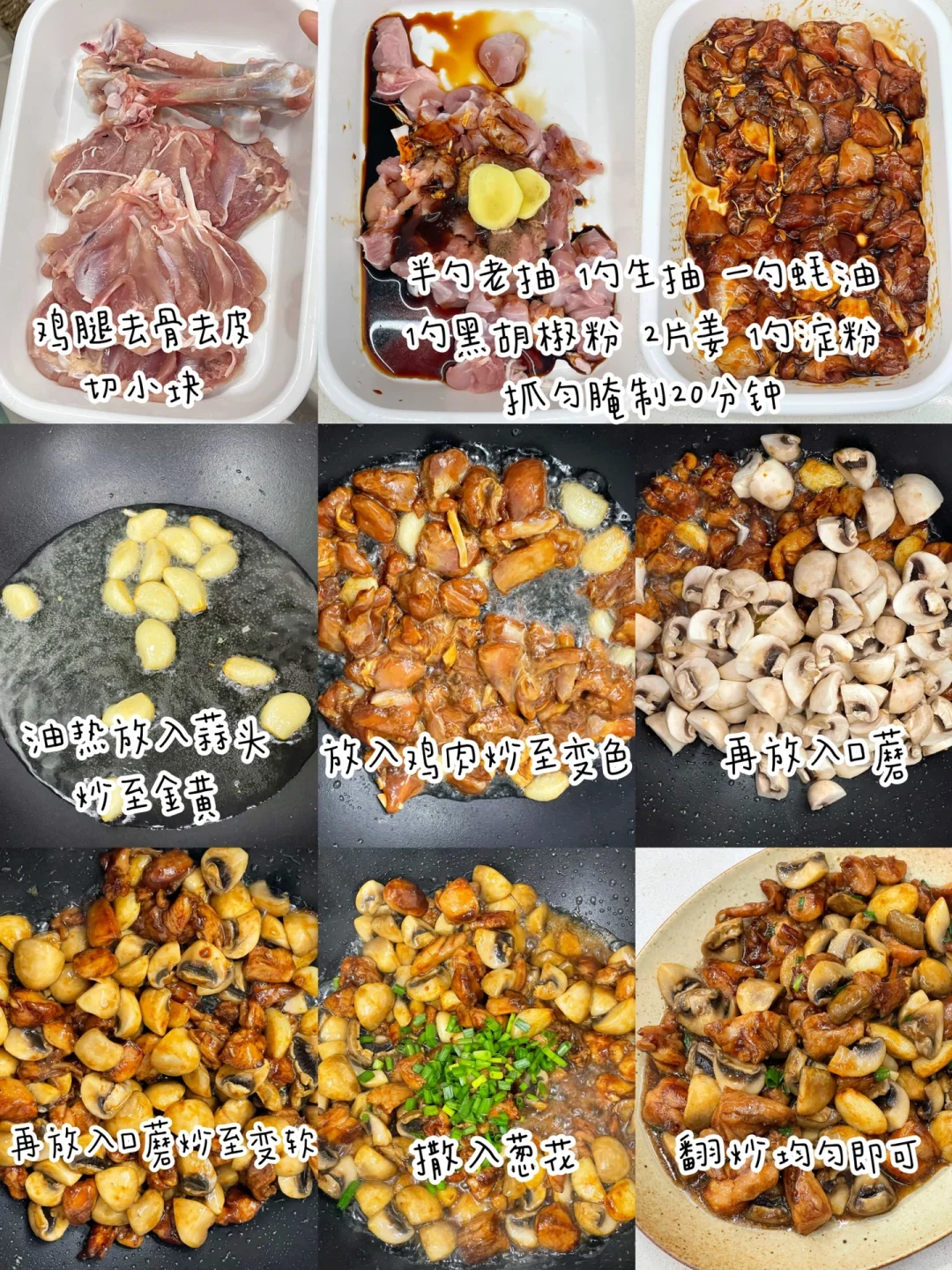 今天孩子点名要吃蒜香口蘑鸡,马上安排,真的每次做孩子都能轻松吃掉一大碗饭,超下饭的说[偷笑R] ✅准备食材:鸡腿(琵琶鸡腿3个)、口蘑、蒜头适量 ✅制作方法: 🔹鸡腿去骨去鸡皮(愿意吃鸡皮的不去也可以)切小块,加半勺老抽、1勺生抽、1勺蚝油、2片姜片、一勺黑胡椒粉、一勺淀粉抓匀,腌制20分钟. 🔹锅中倒油,油热放入蒜头翻炒至变黄,倒入鸡肉翻炒变色.再倒入口蘑翻炒变软,最后撒入葱花,翻拌均匀即可.