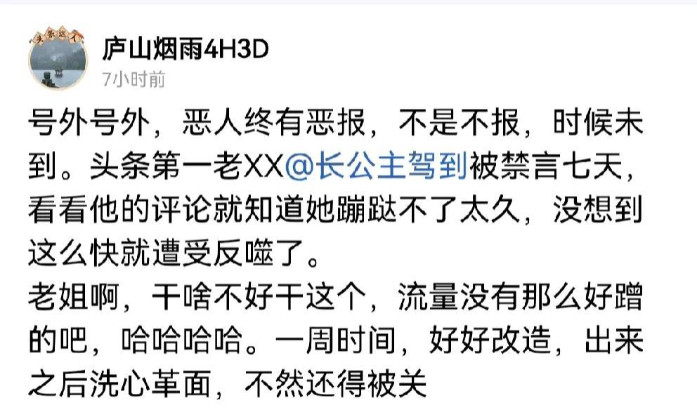 庐山烟雨检到枪,又在无根据臆想症造谣!根据不知从那里转发的主播一方之言在黑人,只暗示又不讲全名,自己几个号轮流被封,还在嘲笑长公主驾到被禁言!#聊聊奇葩言论# 也徒增加份笑料!