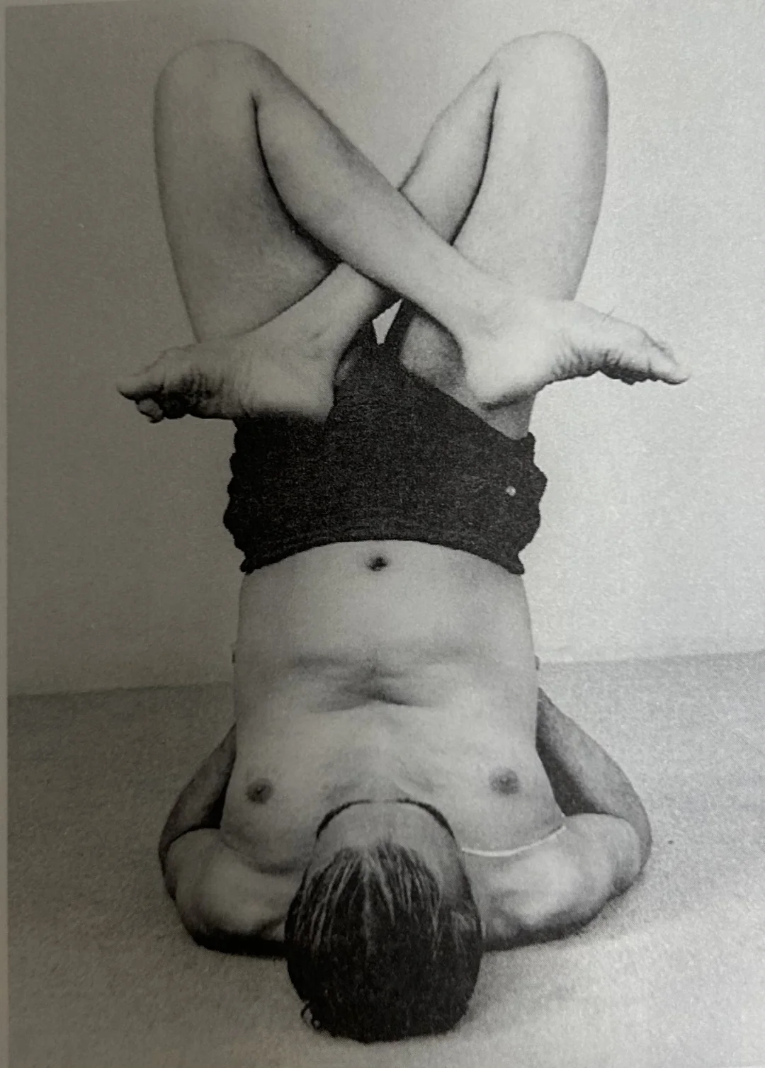 再说说莲花肩倒立。当内脏向后下沉向肩的方向,就会带动大腿骨的外旋外展,你就会想去进入双腿向外打开的状态,但此时双腿分开成2部分会感觉人有点散,而当你下肢骨骼灵活度正常的话,双腿盘莲花会带给你一种向内拥抱自己的舒适稳定感,既满足了大腿骨的需求又满足了身体凝聚一体的需求。而且内脏流淌向后向肩会带动骨盆的内旋包裹,即使大腿骨向外,但骨盆始终处于一种内收的力量,这种开髋是安全的。所以我猜想这个体式很久前被发明的时候,应该是源于当下的身体感知和需求,大脑里有个声音告诉你“现在这么做是更舒适稳定的”,而不是源于炫酷和炫耀的目的。当我们静下心来用身体去感知体式存在的意义,很多答案就会如灵感般闪耀而出,尊重身体,尊重自己的感觉。
