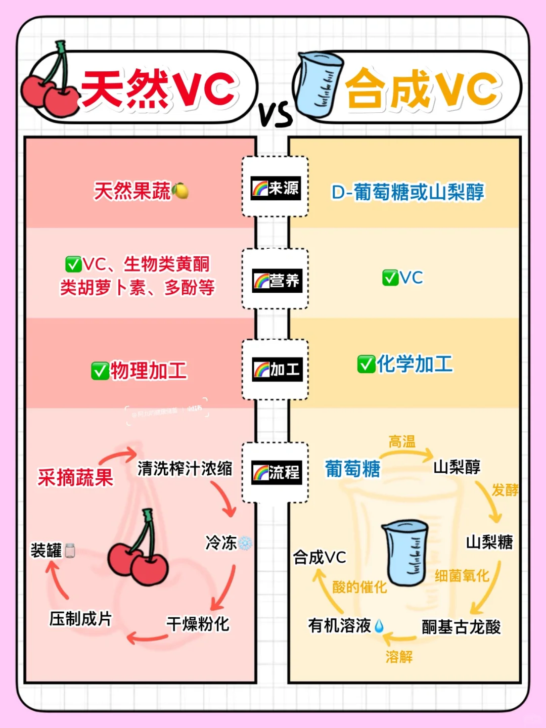 而天然维C原料为蔬果,仅通过物理加工工艺生产,比如榨汁、干燥成粉等,保留了果蔬中的营养物质,所以不仅含有维C,还有天然蔬果中的生物类黄酮、类胡萝卜素、多酚等更多有益物质,可以起到协同作用,吸收效率也更高。