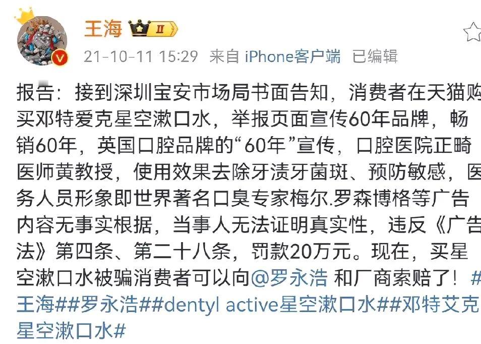 笑死,罗永浩在吃瓜“辛巴大战三之羊”,幸灾乐祸时,不知被王海盯上了?交个朋友直播间卖过一款嗽口水被深圳相关部门因虚假广告罚20万元,王海微博举报并@了老罗,看来老罗又要失笔小财了#潘罗永浩推荐#