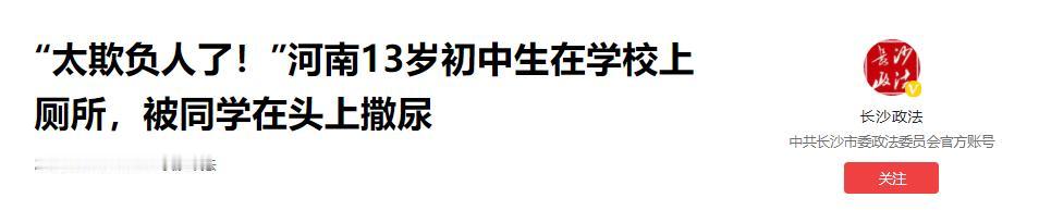 “天生的坏种!”河南许昌,13岁男生小军在学校卫生间内遭遇1米8高的同学小基恶意侵犯,对方竟当着小军面撒尿,导致小军全身被尿液淋湿,事后施暴者家长却以"闹着玩"为由拒绝道歉赔偿,受害者父亲愤而将施暴者告上法庭索赔1.2万元,法院的判决亮了! 信源:长沙政法2024-05-06——“太欺负人了!”河南13岁初中生在学校上厕所,被同学在头上撒尿 在河南许昌一名13岁的男孩小军在学校卫生间蹲坑如厕时,遭遇了令人发指的校园欺凌事件,他的同班同学小基一个身高接近1.8米的"大个子",竟然恶意地在小军头上撒尿,导致小军全身被尿液浸湿,陷入了极度的屈辱和无助之中。 这起事件的发生揭示了校园霸凌问题的严重性,作为受害者小军不仅遭受了身体上的侵犯,更承受了巨大的精神创伤,他独自一人在水龙头前冲洗身体,试图洗去那令人作呕的气味,但内心的伤害却难以抹去。 面对这样恶劣的欺凌行为小军的父亲勇敢地站了出来,决心为儿子讨回公道,他先是报警但由于小基未满14周岁,无法对其实施拘留处罚,于是,他又将小基告上法庭,要求赔偿1.2万元,其中包括1万元的精神抚慰金。 让人感到不解的是小基的家长竟然认为这只是孩子之间的"玩笑",并提出了一个敷衍了事的赔偿方案:500元现金加一套新校服,这种态度无疑是对受害者的二次伤害,也反映出一些家长对校园欺凌问题缺乏足够的重视。 在法庭上双方针锋相对各执一词,小军父亲坚持认为小基的行为已经严重侵犯了儿子的身心健康,理应承担相应的法律责任,而小基的家长则极力否认这是一种故意欺凌,认为索赔金额过高。 最终法院作出了判决,认定小基的行为构成了侵权,支持小军精神损害赔偿的诉求,法官指出小基的行为对小军造成了严重的精神伤害,这种伤害可能会对其未来发展产生长期影响,不过,由于缺乏证据证明直接经济损失,法院并未支持相关赔偿请求。 这起案件虽然告一段落,但其引发的思考却远未结束,它再次敲响了校园欺凌的警钟,提醒我们必须高度重视这一问题,建立更加完善的预防和处理机制,同时它也引发了人们对未成年人法律责任界定的讨论,如何在保护未成年人权益的同时,让他们意识到行为的后果。 作为社会的每一个成员,我们都有责任营造一个友善、包容、尊重他人的环境,只有从小培养孩子们的同理心和责任感,引导他们学会换位思考,懂得欣赏彼此的不同,我们才能真正遏制校园欺凌现象的发生。 这起事件在网上引发了广泛的讨论和关注,很多网友对小基的行为表示强烈谴责,认为这已经超出了恶作剧的范畴,是一种赤裸裸的欺凌,有人指出如果不是小军父亲的坚持,这件事可能就这样被掩盖过去了,这反映出校园欺凌问题的隐蔽性和复杂性。 也有网友对小基的家长提出了质疑,认为他们的态度过于轻率和不负责任,"500块钱就想了事?这是在侮辱受害者的尊严!"一位网友愤怒地写道,另一位网友则表示:"作为家长,首先应该教育孩子尊重他人,而不是包庇他们的错误。" 从法律角度来看,法院的判决体现了对校园欺凌行为的否定态度,但在赔偿金额上似乎还不够,精神损害赔偿的数额应该更高,这才能体现对受害者精神创伤的重视。 这起事件也引发了人们对校园管理和教育模式的反思,很多人呼吁学校应该加强对学生的心理健康教育,提高学生的同理心和责任感,同时,学校也应该建立更加完善的欺凌预防和处理机制,为学生提供一个安全、友好的学习环境。 其实校园欺凌问题的根源是复杂的,既有家庭教育的缺失,也有社会环境的影响,"我们不能只关注事后的处理,更要注重事前的预防,这需要学校、家庭、社会的共同努力。" 这起事件也引发了人们对未成年人保护法的讨论,一些人认为现行法律对未成年人的责任认定还不够明确,导致一些欺凌者可以逃避应有的惩罚,他们呼吁应该进一步完善相关法律,加大对欺凌行为的惩治力度。 回顾整个事件我们可以看到,一个看似简单的校园欺凌案件,其实反映出了我们社会的多个层面问题,它提醒我们,保护未成年人的健康成长,需要全社会的共同努力。 我们每个人都应该成为这场守护童年的战士,作为家长我们要以身作则,教导孩子学会尊重,作为教育工作者我们要用爱心和耐心呵护每一个学生,作为社会的一员我们要为构建友善包容的环境贡献自己的一份力。 让我们携手并进共同书写一个没有欺凌与伤害的美好未来,让每一个孩子都能在阳光下自由地成长,让每一个生命都能绽放出最美丽的光彩,这是我们所有人的心愿,也是我们不懈的追求。