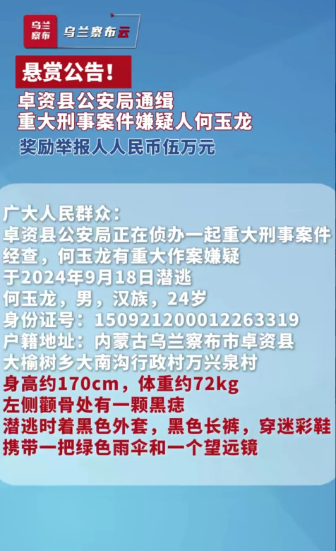 近日,内蒙古警方发布了一则5万块的重大杀人案悬赏通告。那么,犯罪嫌疑人24岁何玉龙到底所犯何罪呢?让我来告诉你们事情是怎么一回事。事情发生的时间是9月15日,发生的地点是内蒙古乌兰察布市卓资县大榆树乡大南沟行政村万兴泉村,何玉龙是曾经犯过罪蹲过牢房的刑满释放人员。他在刑满结束回到家后,跟家里人要钱打赏网络主播遭到家里人的拒绝,一气之下恼羞成怒,杀害了他的父母及爷爷,并于9月18日开始潜逃。 发生了这种事情实在令人痛心,并让我们引发无数沉思,到底什么样的家庭才会教育出这样狠心的孩子? 希望何玉龙早日被缉拿归案,还这个世界一个清静,让很多人不再担惊受怕。