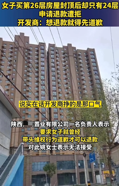 “我买的26层,你只盖到24层就封顶?”陕西,一女子花22万,买了一套26层的房子,岂料,2年后楼盘封顶,却只有24层!女子大怒,找开发商赔偿,可对方却反说女子闹事,给他们造成100万损失,要她道歉才肯给钱!