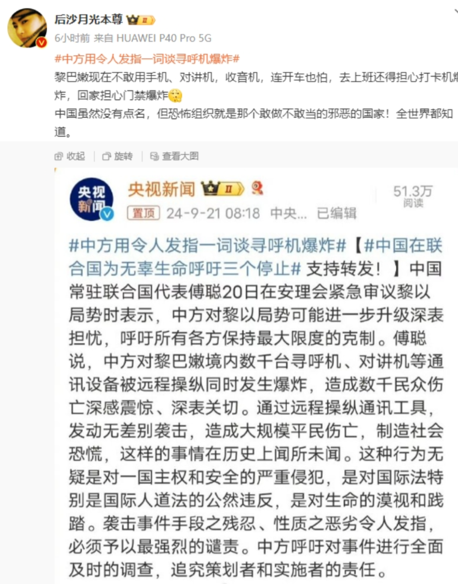“中方对黎巴嫩境内数千台寻呼机、对讲机等通讯设备被远程操纵同时发生爆炸,造成数千民众伤亡深感震惊、深表关切。通过远程操纵通讯工具,发动无差别袭击,造成大规模平民伤亡,制造社会恐慌,这样的事情在历史上闻所未闻。这种行为无疑是对一国主权和安全的严重侵犯,是对国际法特别是国际人道法的公然违反,是对生命的漠视和践踏。袭击事件手段之残忍、性质之恶劣令人发指,必须予以最强烈的谴责。中方呼吁对事件进行全面及时的调查,追究策划者和实施者的责任。”