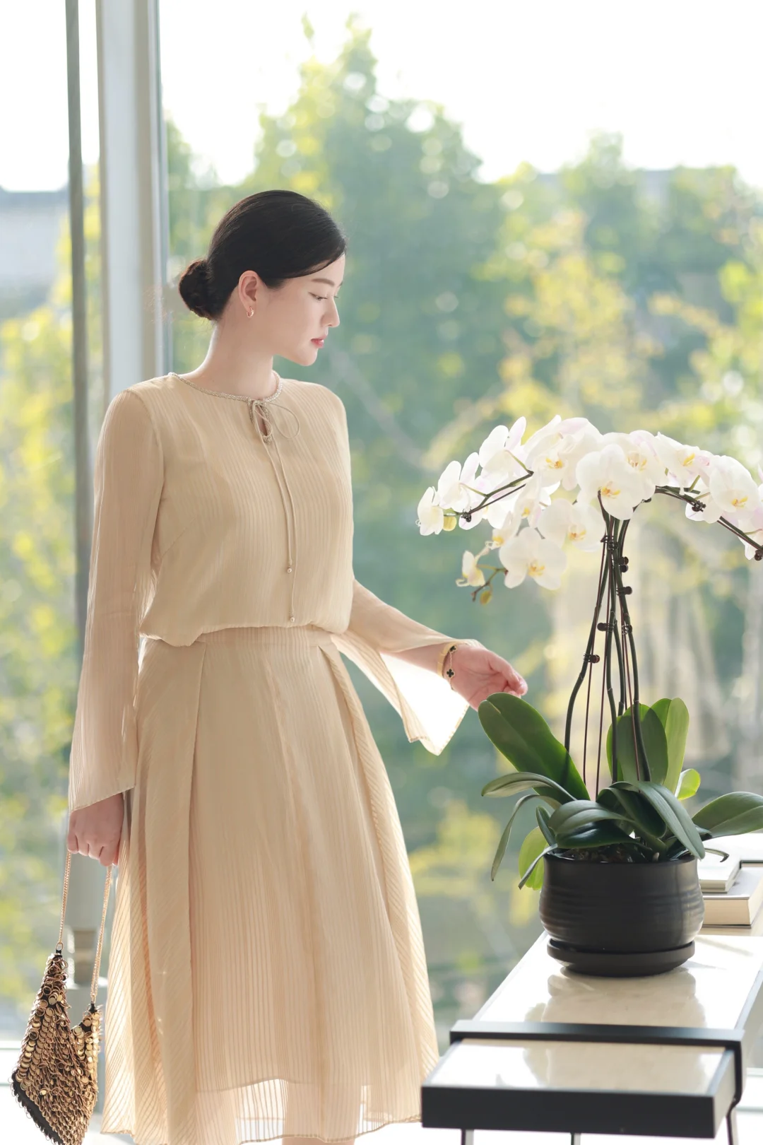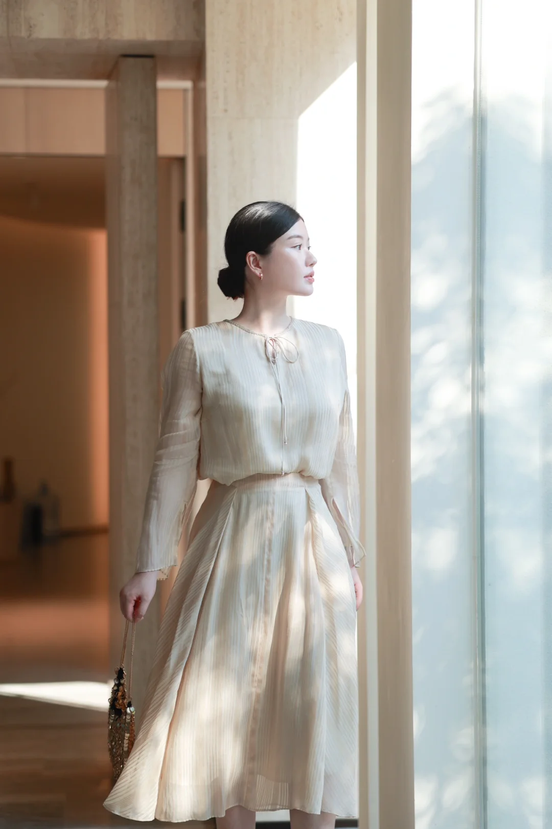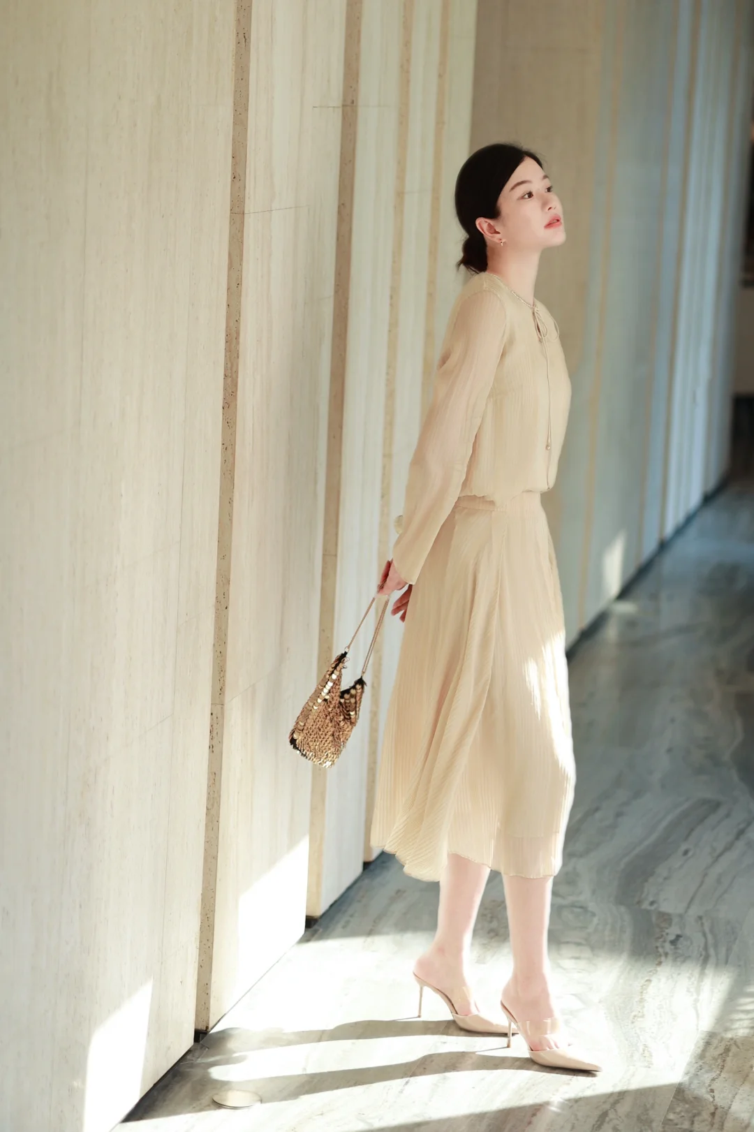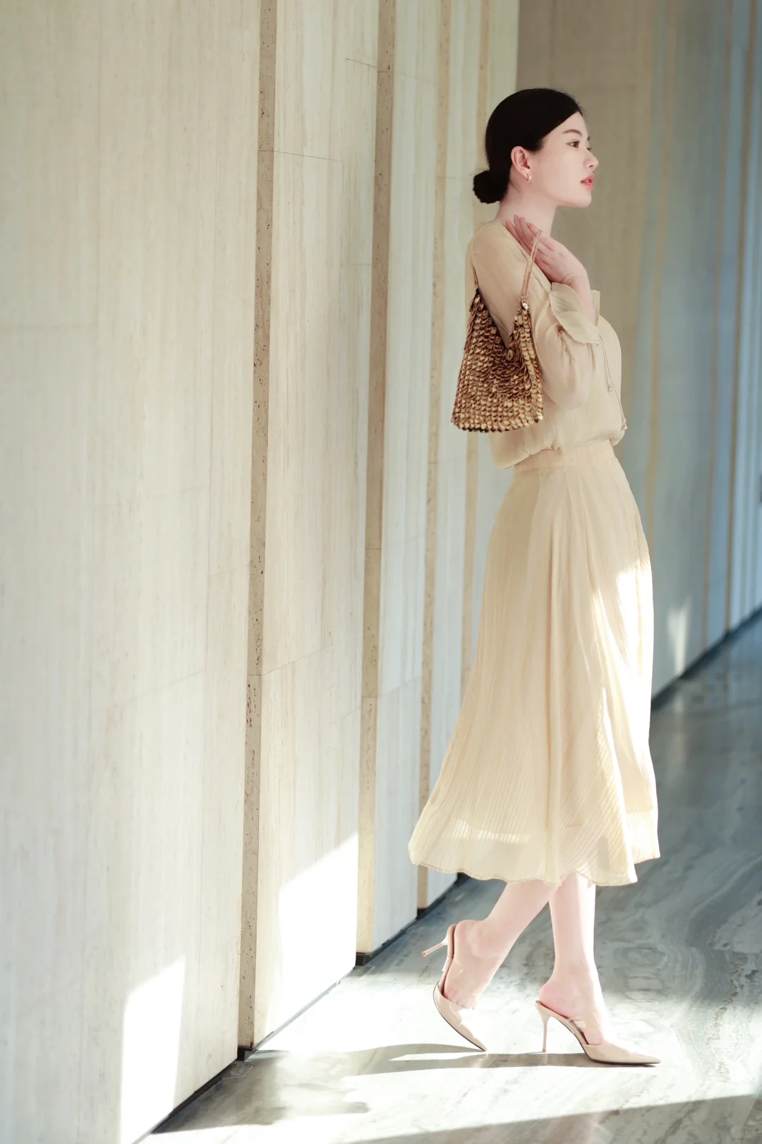 🪐香槟金色系衬衫与半裙经典温柔,双层薄纱的质地上还呈现出水波纹的肌理感,不论视觉上、触感上都考究。