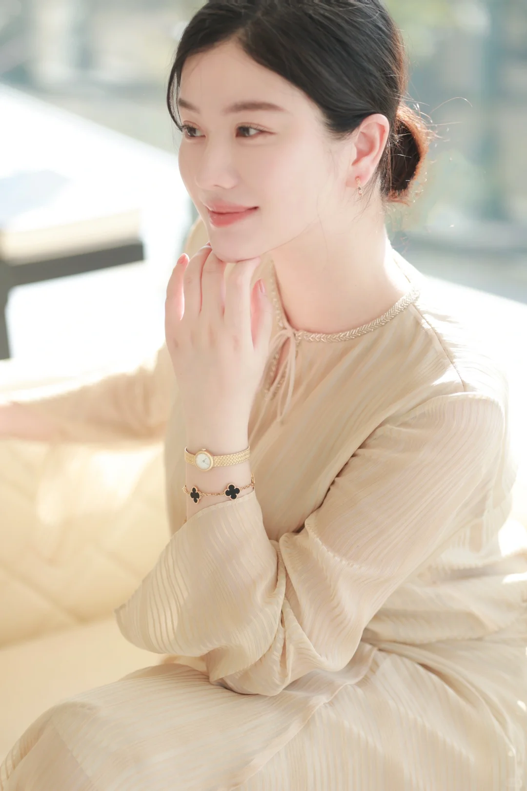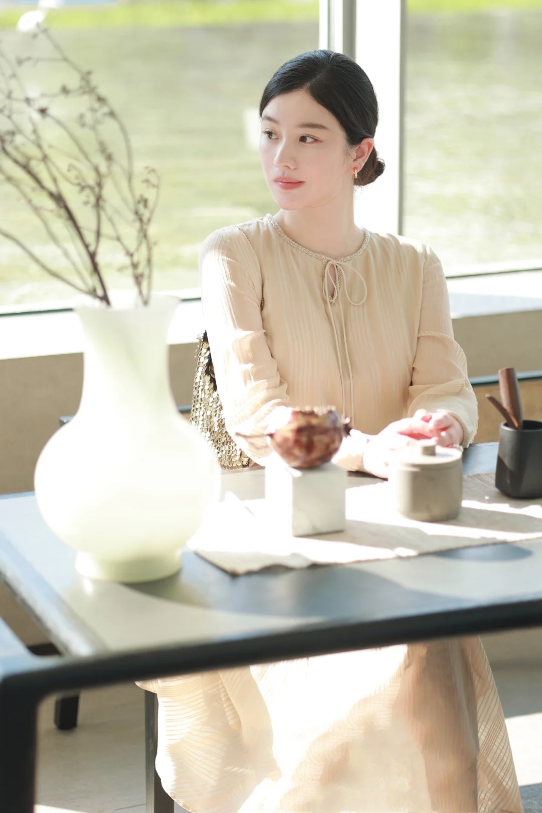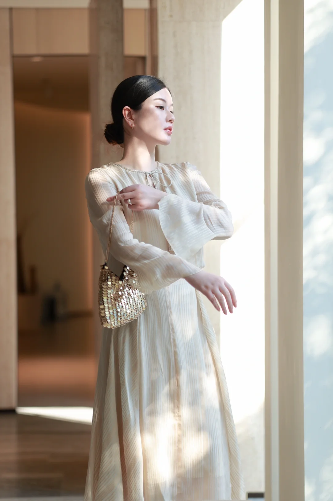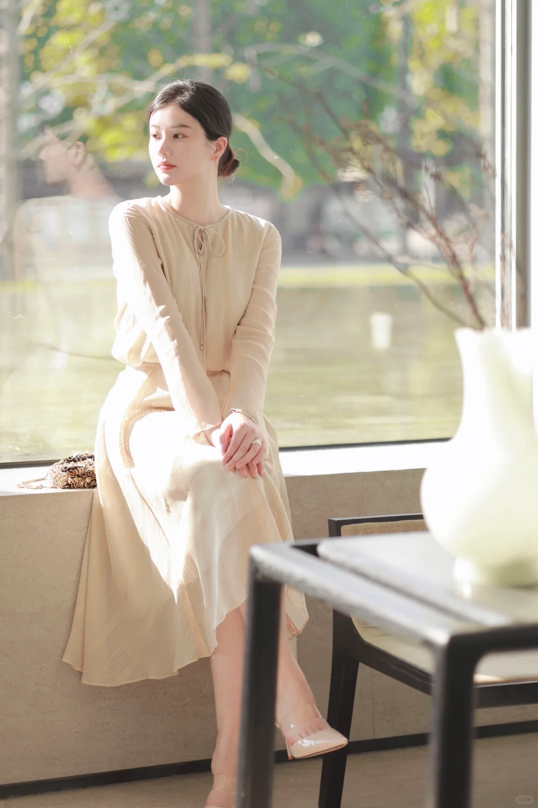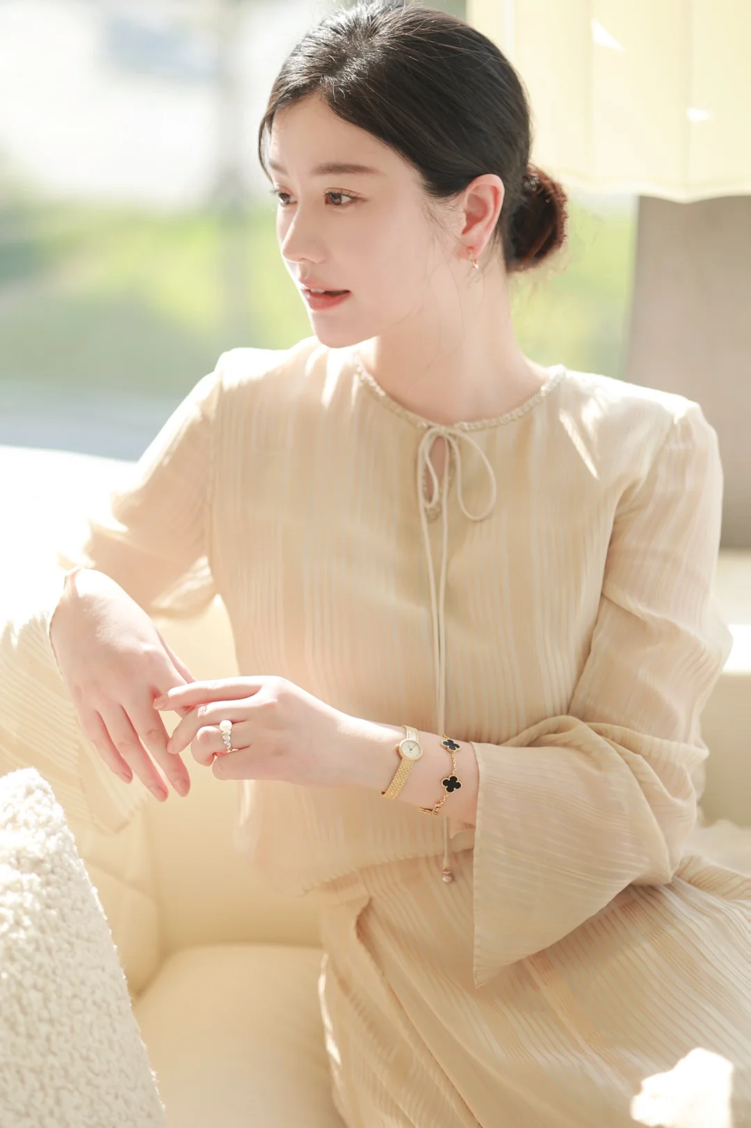 🪐香槟金色系衬衫与半裙经典温柔,双层薄纱的质地上还呈现出水波纹的肌理感,不论视觉上、触感上都考究。