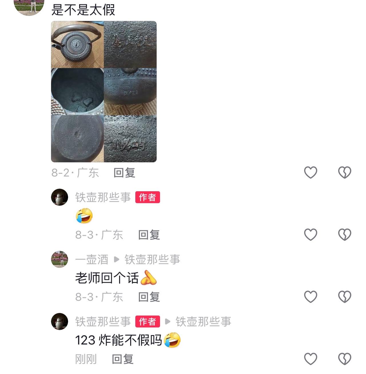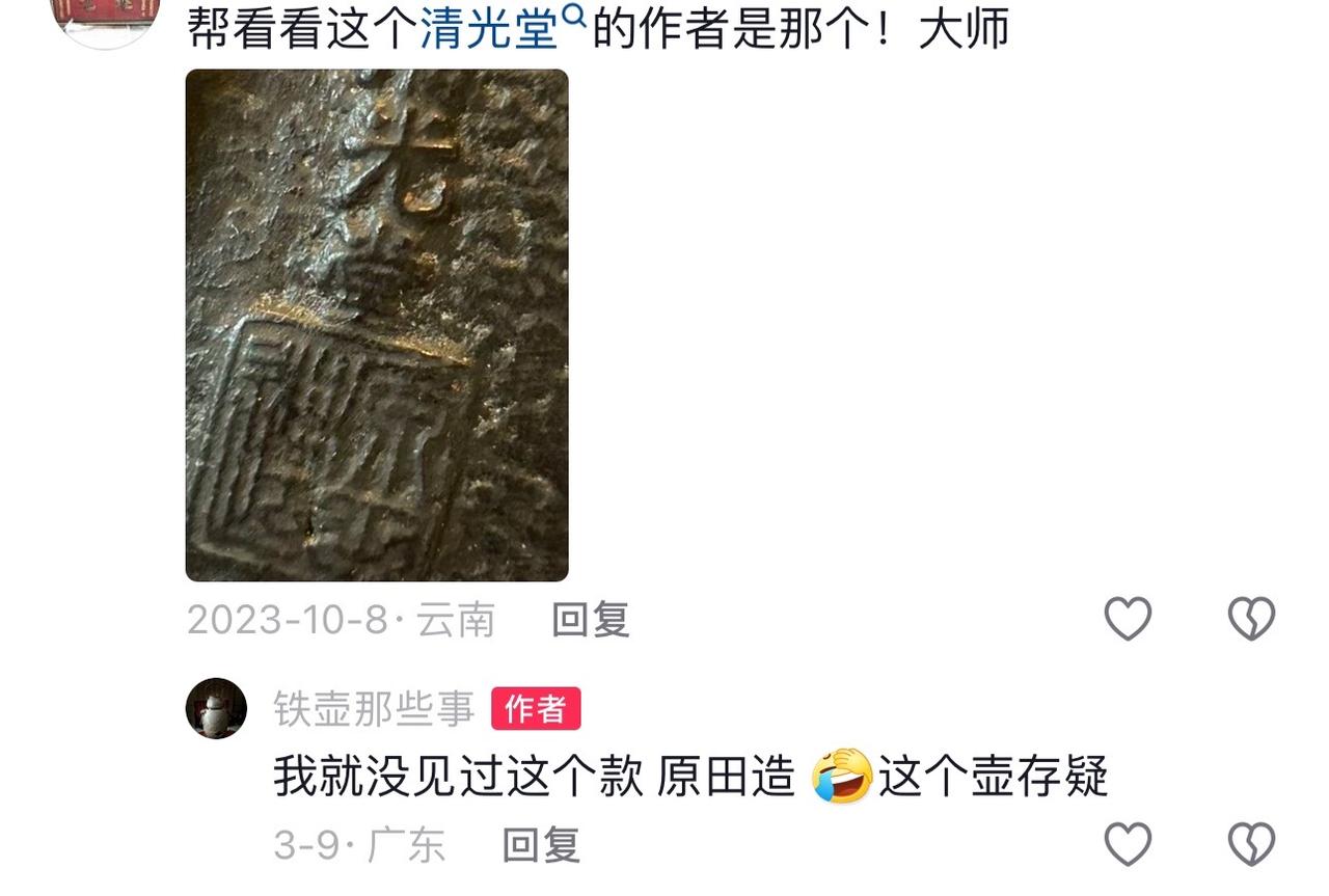 现在假的技术不单单只是粗糙“商周”产,比较厉害的“何必”造,和日本卷草皮的合作把真的日本老铁壶拿去三 D 打印出磨具,无限量的生产,就这么说吧,唯一的问题就是铁这个问题解决不了,哪怕收回来便宜的日本铁器去回炉铸造都看得出来,还有高级点的日本工艺品当老壶,这块就复杂很多,还有改炮口,换底,换铸孔,配铁盖。南部名家也不放过,盛久的丸子,加拿大进口铁,台湾造。五花八门的,所以买日本老铁壶最好到正经的老玩家手里,想捡漏的机会都没有。#在茶汤上作画的非遗技艺 #茶具好物推荐 #从泡杯茶开始享受生活 #围炉煮茶香遇八马 #非遗技艺