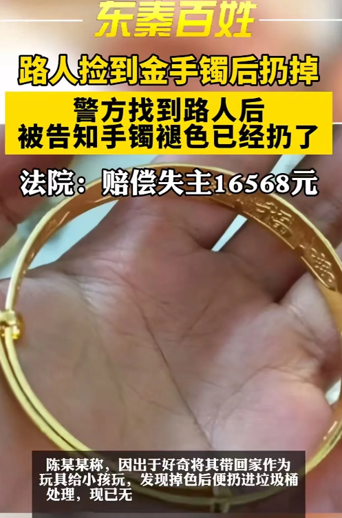 “法官又判糊涂案了?”江西九江,女子在路上捡到金手镯,发现掉色将其扔掉,可警察却找上门让她归还,女子拿不出来被失主起诉要求赔偿!女子:“你怎么证明我捡到的金手镯是真的?”可法院却判女子赔16568 元!网友:这样判的话,天天扔假手镯等着发财!