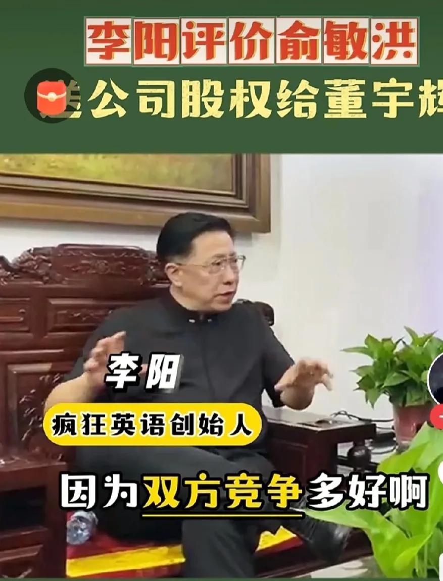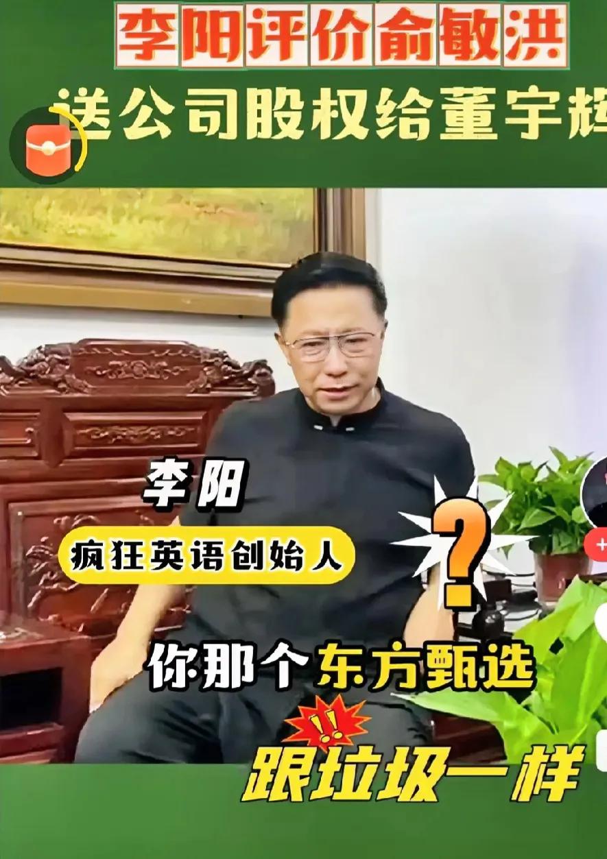 哈哈,李阳老师太敢说了,李阳老师接受采访说余老师送公司给董宇辉是傻B行为,这样讲真的不伤了余老师的心吗?外行看热闹内行看门道,李阳根本不知余老师要什么,人家金钱.地位.事业全有,到老了还花钱买难受?花自己的钱自己享受聚光灯也是心灵需求,不是吗?反正有的是钱,几辈子都花不完,何不花自己身上?#李阳评价俞敏洪#