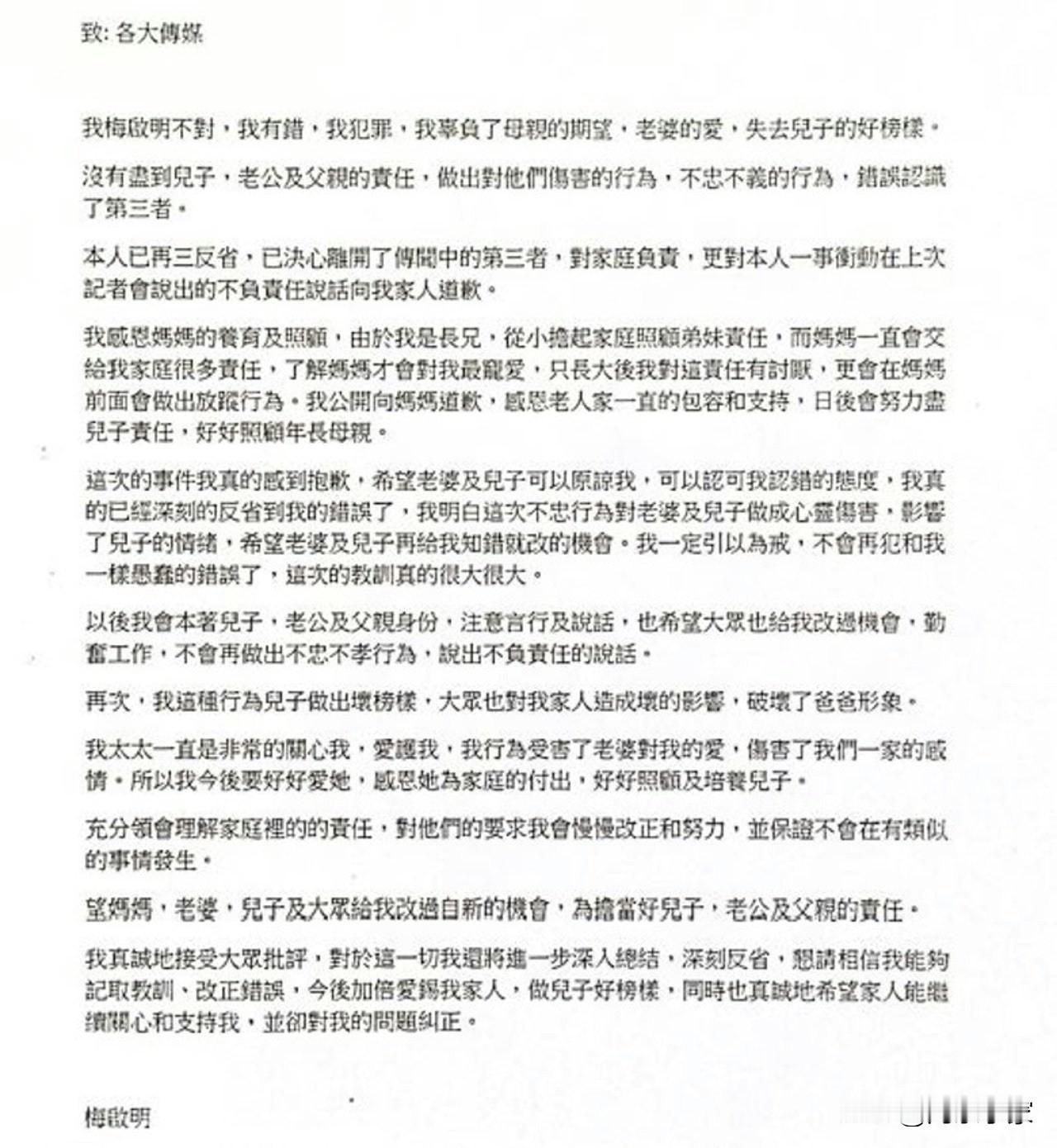 梅启明否认第二任老婆Joey未离婚指控 称冇抛弃个仔:我一定要 已故天后梅艳芳的72岁胞兄梅启明昨日(6日)惊爆婚讯,他宣布与泰籍女友May May再婚,预告周四(10日)於中环大会堂举办记者招待会,公布摆酒及婚宴详情。梅启明更希望透过传媒寻妈,他指很担心梅妈处境,希望她见证及拍板筹办自己的婚事,公开呼吁母亲梅覃美金(梅妈)和侄仔梅柏麟联络他。 不过,其第二任太太Joey就向传媒表示二人未离婚,直指梅启明说谎,更指如果他现在结婚就是重婚,透露即使之前梅启明说要娶妾侍,自己都从未同意。Joey表明自己从未说过要找法律援助办离婚事宜,只是去「谘询」有关离婚的事情:「由始至终,我都冇同梅启明提过话我会搵法援帮手搞离婚。」 Joey自从前年梅妈发声明与梅启明断绝母子关系後,已经带同与梅启明的儿子回到马来西亚居生活,梅启明曾发声明指不会与Joey离婚,更不会拆散自己的家,亦向儿子表示泰籍女友May May已经「搵够钱」回到泰国。《01娱乐》向梅启明查询是否未离婚,他说:「离婚嗰度梗系离,佢已经搞紧法律援助,搞离婚。」当讲到Joey向传媒表示自己只是去谘询,并获社工告知冇申请法援的资格,他回答:「佢去谘询,即系申请啦。」 记者再追问二人到底有冇离婚,梅启明表示:「一早就离,冇喺埋一齐咁多年,五、六年咁耐。(有冇正式签署文件?)正式签过嘅文件就唔需要而家讲,10号再讲。」他强调10号的记者会不会受影响,将如期举行,反问:「点会取消!」 此外,Joey向传媒称,年初两母子曾与梅启明见过面,男方一见到个仔即走唔切,以为Joey要掉个仔畀佢,斥他不肯尽父亲责任、衰过《东张西望》何伯,梅启明却否认说:「个仔我一定要,点会唔要个仔,傻嘅!个仔永远都系我个仔,点会唔要啫?」