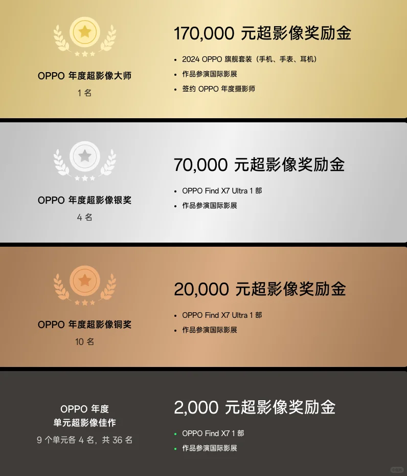 从年初开始,OPPO 2024超影像大赛终于到了公布/颁奖环节,很多小伙伴悬着的心快要落下了[吧唧R]毕竟这次比赛奖励很丰富,有17万呢。