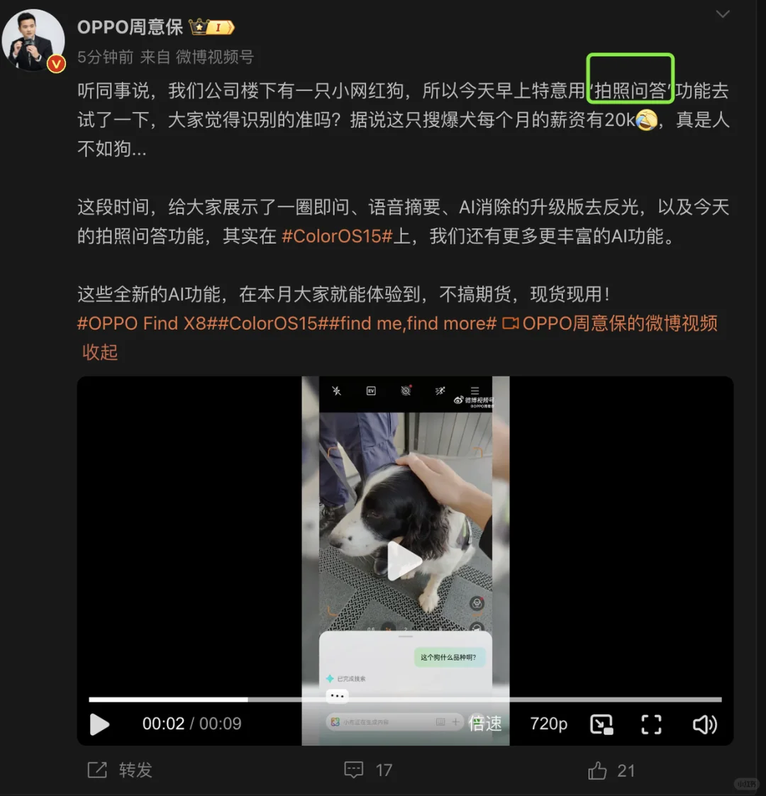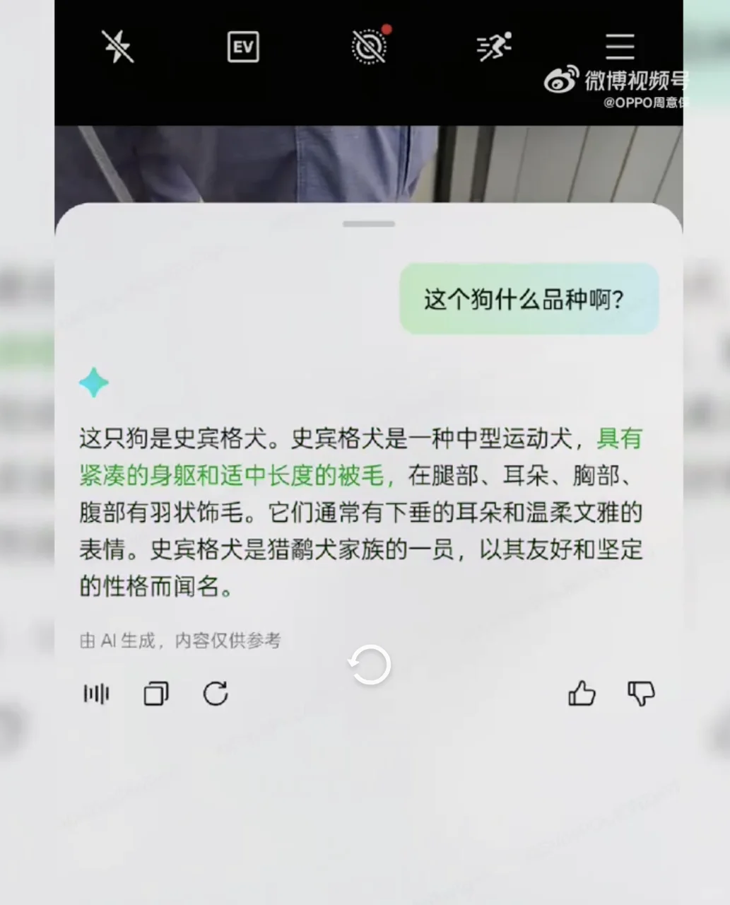 📷已知有AI去反光,很适合博物馆拍文物、高铁飞机上拍风景;「拍照问答」,打开拍照界面就能识别物品,OPPO Find产品经理周意保询问了小狗的品种,这有点熟悉吧,库克欲哭无泪[笑哭R]。还有流畅度,ColorOS 15又进化了,感觉这不输iOS吧?[吧唧R]