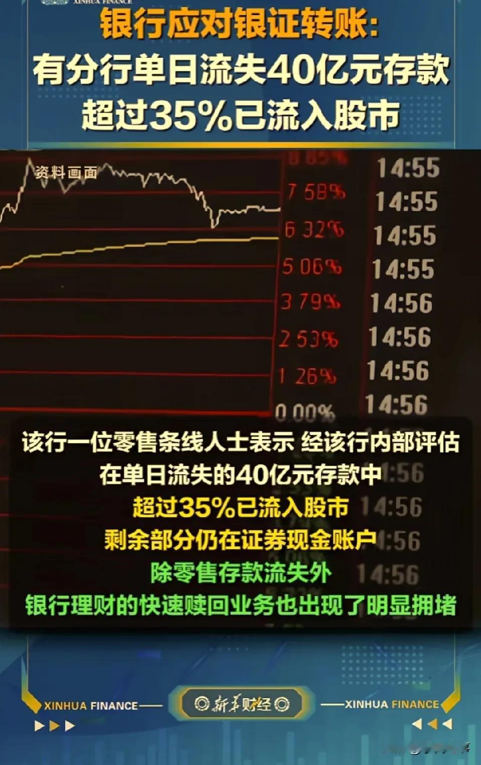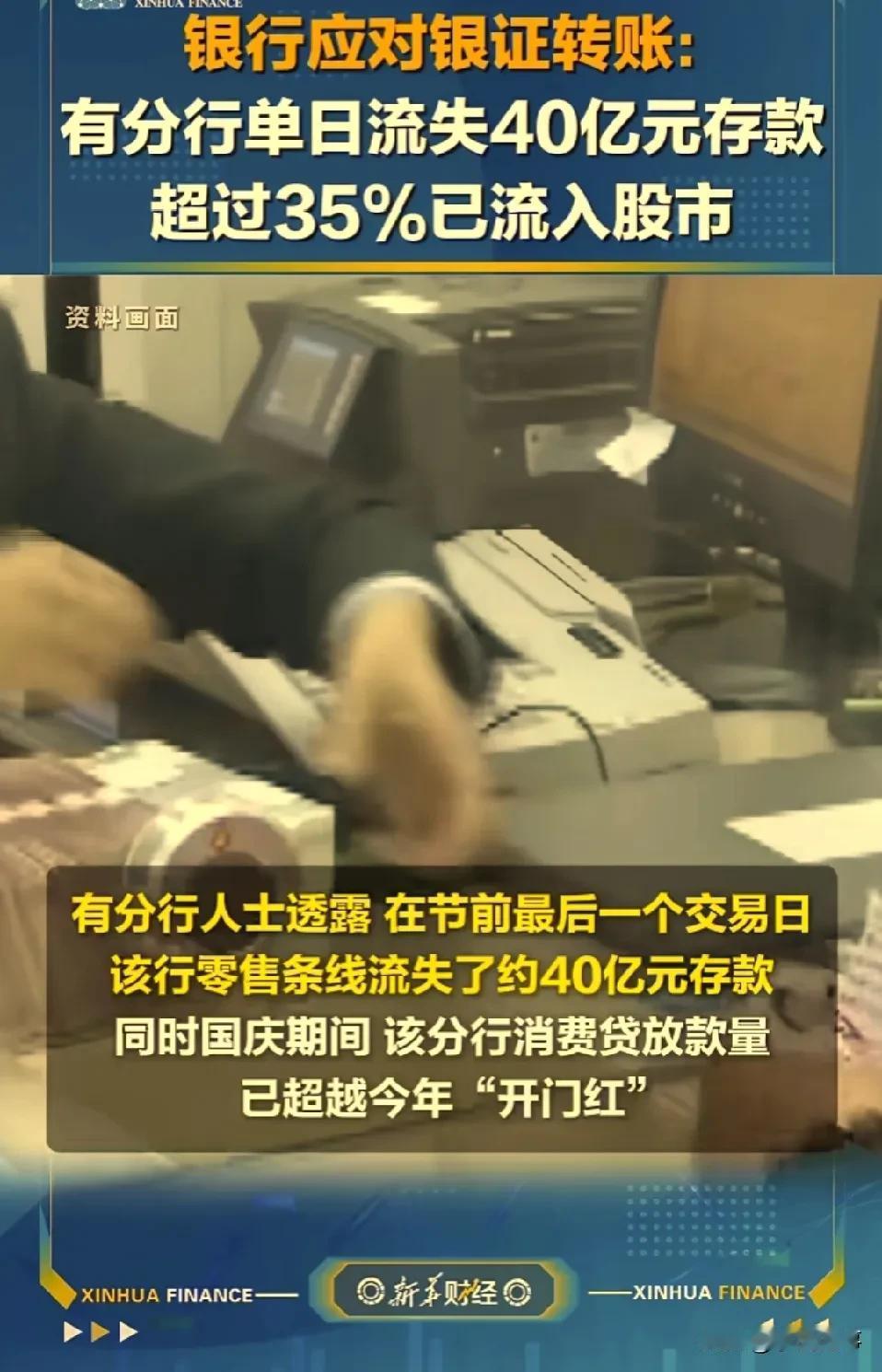 风暴席卷金融界!银行资金上演“大迁徙”奇观!假期尾声,一银行惊爆40亿巨额资金瞬间“搬家”,超三分之一资金如潮水般涌入股市,股市沸腾之谜,悄然藏于这股金融暗涌之下? 证券市场风云变幻,银行存款与理财市场正遭遇前所未有的动荡时刻。据10月9日最新资讯,某银行迅速应对,对银证转账、基金交易等紧急调整布局。值得注意的是,节前收官之战,该行零售存款竟锐减40亿之巨,而国庆假期消费贷市场更是火爆异常,某银行特色信贷产品放款量激增,突破7亿大关,刷新年度记录!深入剖析,这批流失的存款中,逾三分之一已投身股市的怀抱,其余则蓄势待发,静待股市风云变幻。 理财产品亦未能幸免,赎回潮汹涌澎湃,金融市场正酝酿着一场深刻的变革。这不仅是资金的简单流动,更是市场信心与风向的深刻体现!你是否也嗅到了这股投资热潮的气息?快来评论区留下你的真知灼见,与我们一同探寻金融浪潮背后的深层逻辑与故事吧!