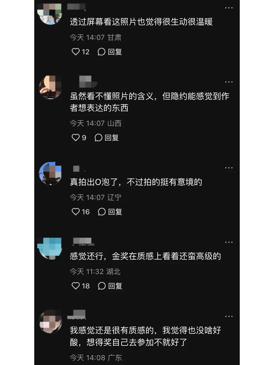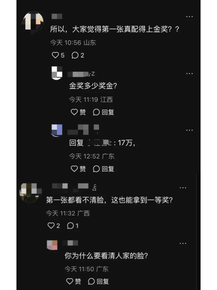 评论区有人在怀疑[吧唧R],有人觉得看不清脸、配不上...但也有觉得这些作品拍得很不错,觉得拍得很有意境、拿17万大奖的照片拍得很高级...
