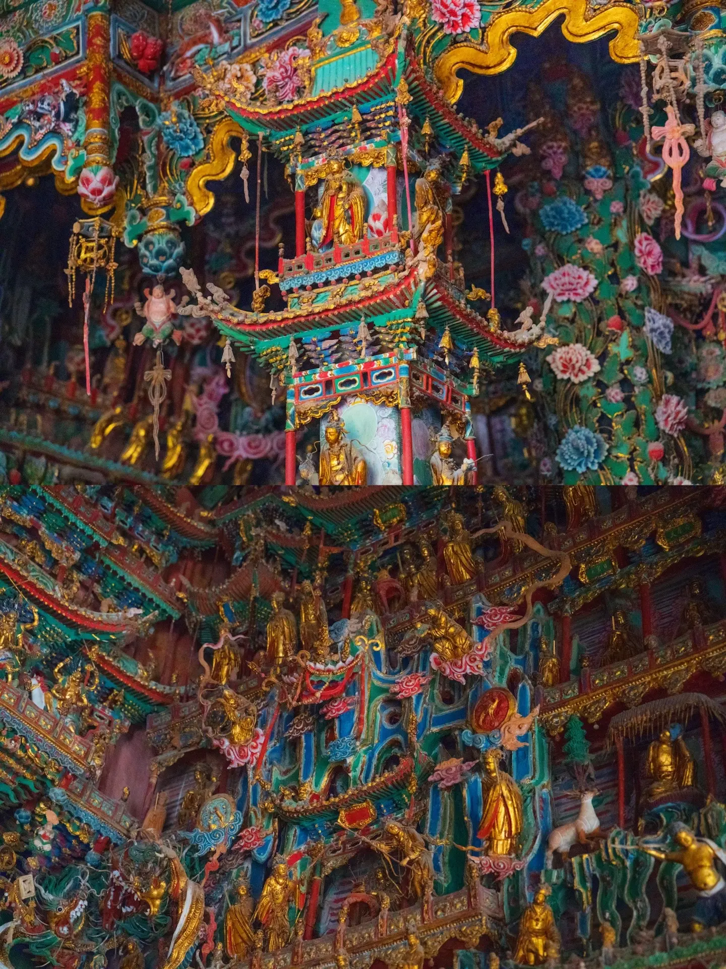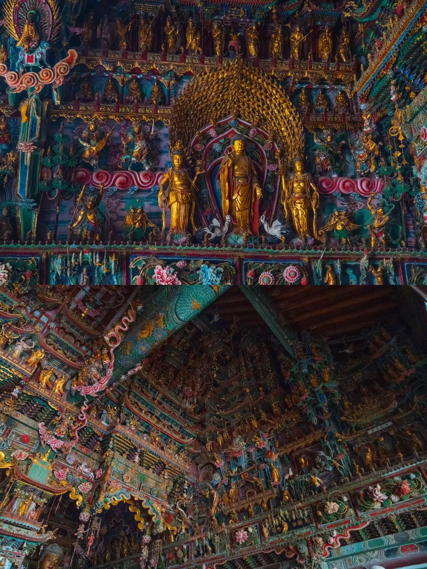 千佛庵的彩塑真的太震撼,层层叠叠的天宫楼阁,云雾缭绕的粉彩妆銮;佛像低眉、垂目、微笑、不动如山,自我观照之中偌大的精神世界交给我们探索,所以无论佛还是道,都是像天地一般宽容的,带我们见天地、见众生……