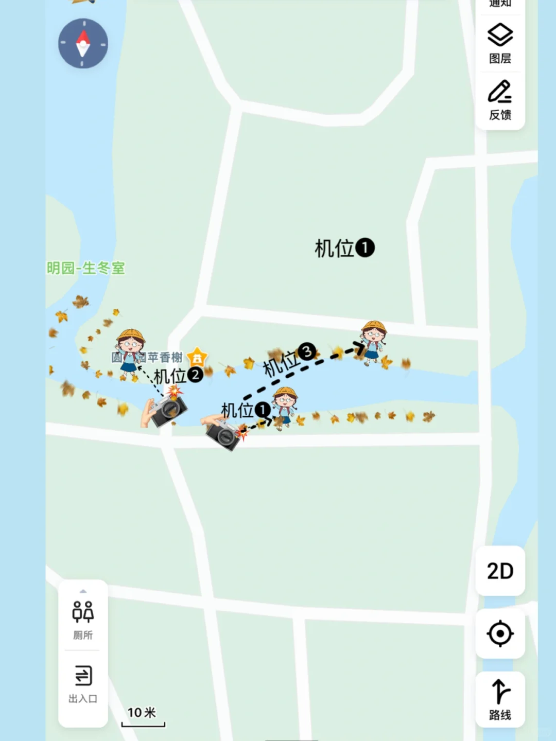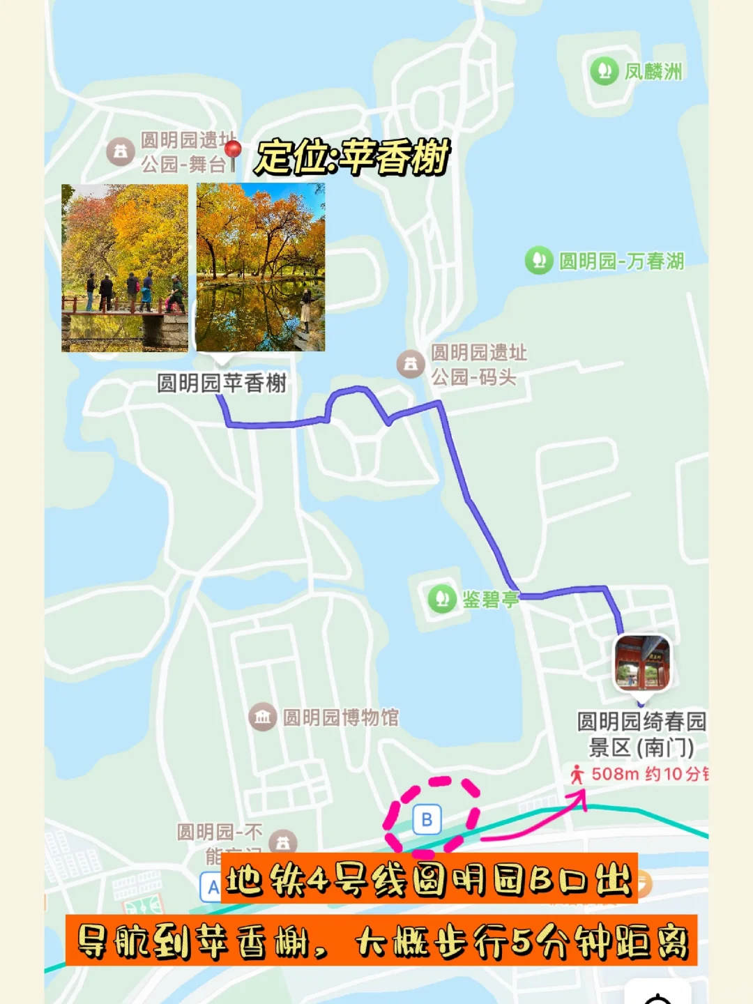 下地铁从圆明园南门进,导航苹香榭,步行大概7分钟就到了拍照位置🚶