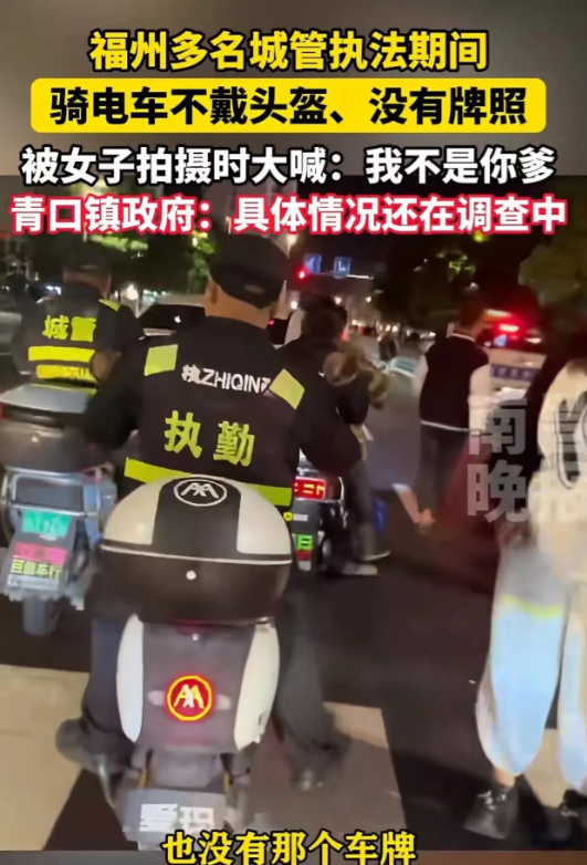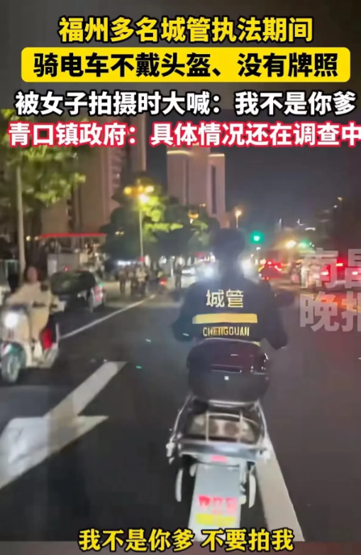 最近,福州青口镇的城管火了,但火的不是他们的“丰功伟绩”,而是一段让人迷惑的视频。视频里,几位身穿“城管”制服的大哥,潇洒地骑着电动车,执行公务去了。等等,这画面好像哪里不对劲? 没错,这些“执法者”竟然都没戴头盔,有的车甚至连牌照都没有!更让人大跌眼镜的是,一位路过的市民随手拍下了这“名场面”,结果却遭到城管的言语攻击:“我不是你爹,不要拍我!” 好家伙,这年头执法都这么硬核了吗? 事情还得从头说起。当天傍晚,青口镇的街道上,几名城管骑着电动车,正在进行日常巡查。突然,他们发现了一位在路边摆摊的女摊贩。接下来的场景,估计大家都能猜到——城管开始对女摊贩进行“教育”。 然而,这次的“教育”似乎有点“用力过猛”。城管不仅态度粗暴,还对女摊贩进行了言语侮辱:“天天这也摆摊,那也摆,你家是乞丐吗?这里能摆吗?” 女摊贩被这突如其来的羞辱激怒了,她反驳道,自己只是为了生存,怎么就成了乞丐了? 争执中,女摊贩发现,这几位城管大哥,身上也不太干净,不但没有按照规定穿戴制服和帽子,甚至所骑得电动车连牌照都没有,头盔更是连带都没带。这一套装扮再加上骂人的粗鄙话语,简直是辱没公务人员的名声。于是就拿起手机开始拍摄。 或许是觉得自己被冒犯了,其中一名城管对着女摊贩吼道:“我不是你爹,不要拍我!” 这一句“金句”,瞬间点燃了网络。视频一经曝光,网友们纷纷开启“吃瓜模式”,评论区瞬间变成了大型吐槽现场。 面对汹涌的舆论,青口镇政府迅速作出了回应。然而,这份回应却让人感觉避重就轻,只是说城管在执法过程中与商贩发生了矛盾,对于城管违规行为只字未提。这样的“调查结果”,显然无法平息网友们的怒火。 其实,网友们愤怒的点很简单:法律面前人人平等,城管作为执法者,更应该以身作则。如果连他们自己都带头违反交通法规,又有什么资格去要求别人遵守呢? “城管不戴头盔”事件,看似是一起普通的交通违章事件,背后却折射出执法队伍建设、依法行政等方面存在的一些问题。这面镜子,照出了我们离法治社会还有多远的路要走。谁都不希望管理者自身存在问题,却不管理。这就和拥有特权有什么区别。 社会中也存在太多这样的事情,往往管理者在管理人的同时,也应该注重自我管理,只有这样才能够更加有说服力。