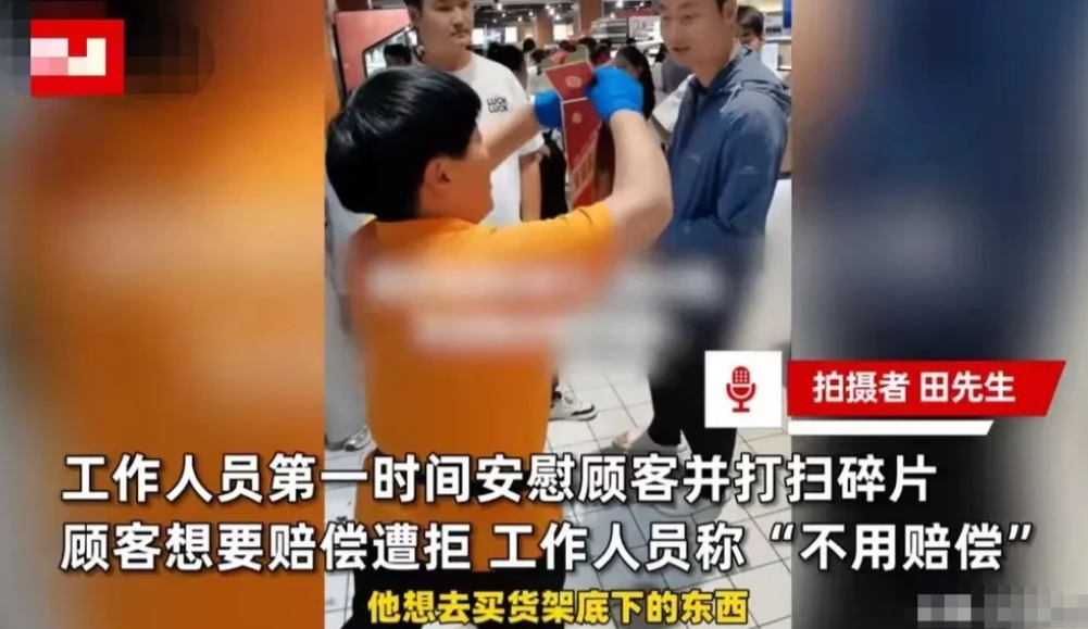 年轻人直起身来,认真地对刘阿姨说:"阿姨,真的不用赔偿。这是我们没有摆放好商品,您千万别往心里去。我们胖东来有规定,顾客不小心损坏商品是不需要赔偿的。"