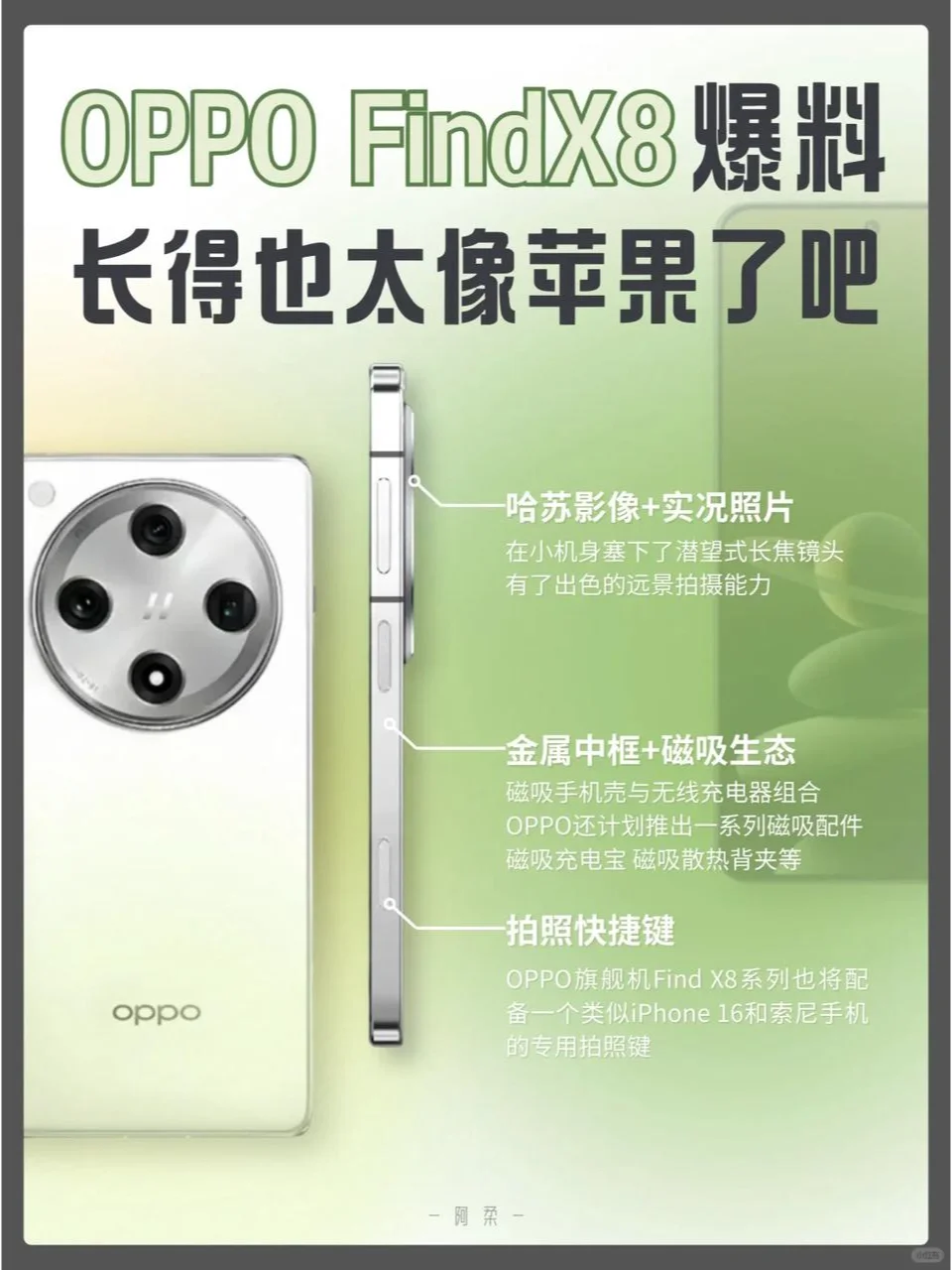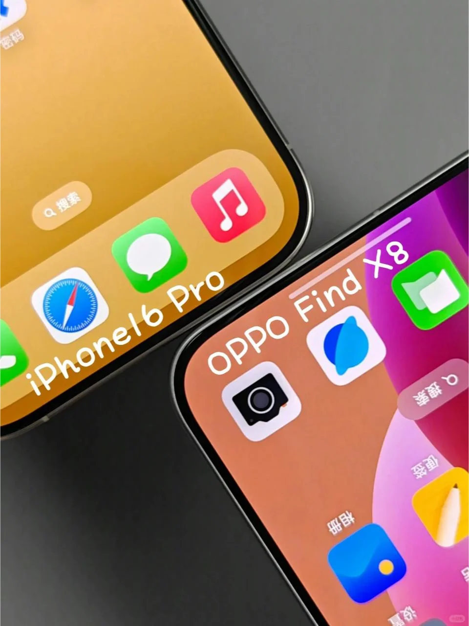 OPPO Find X8直屏尺寸也比常规手机小,[斜眼R]但配置很全面,甚至一度让iPhone用户破防!也是搭载天玑9400,有大底潜望长焦、5600mAh大电池,但比iPhone 16 Pro薄!屏幕四边极窄,加上灵动岛的流体云、实况照片📷、与苹果互传文件、磁吸无线充电,这比苹果还苹果🍎!