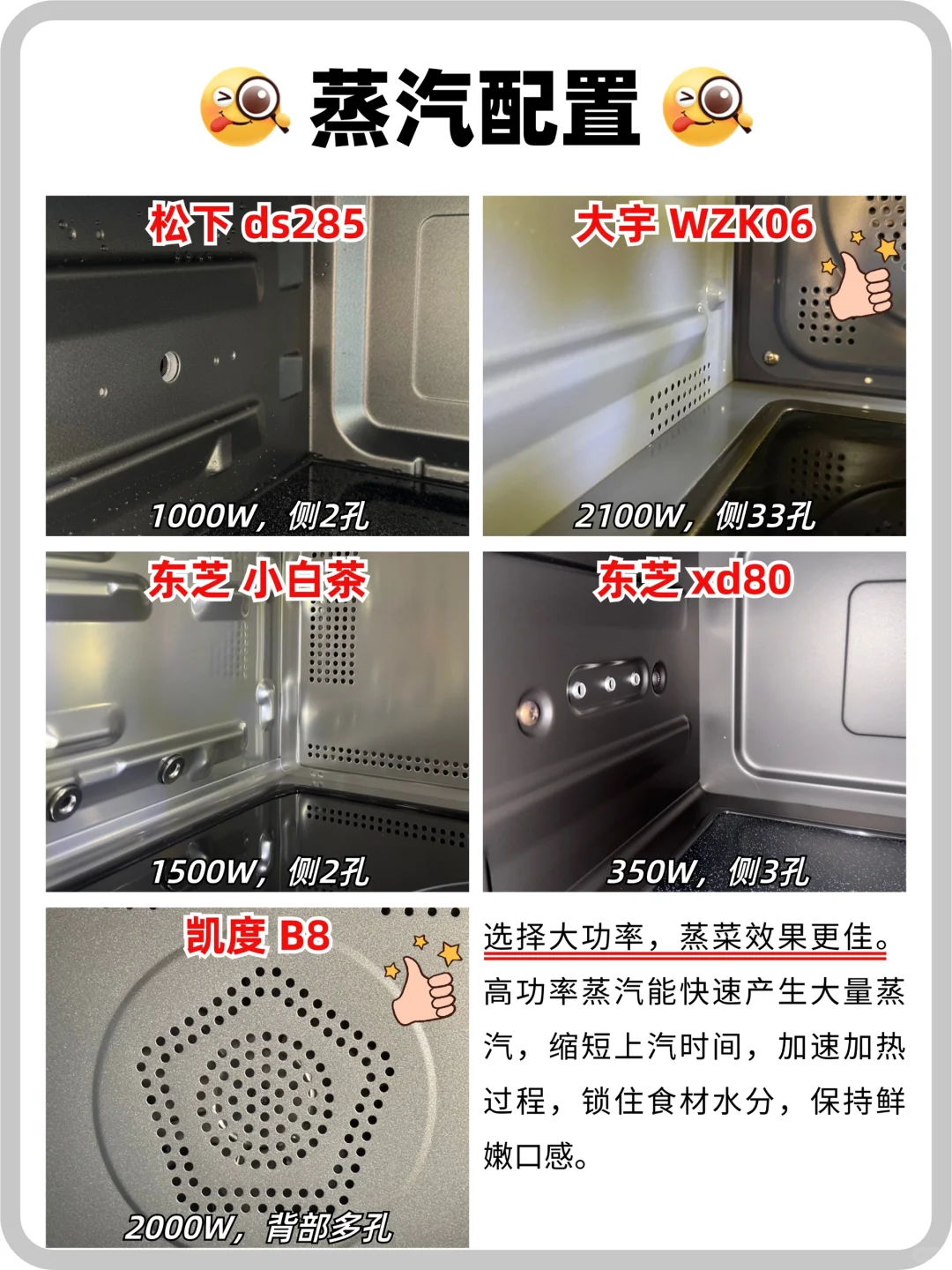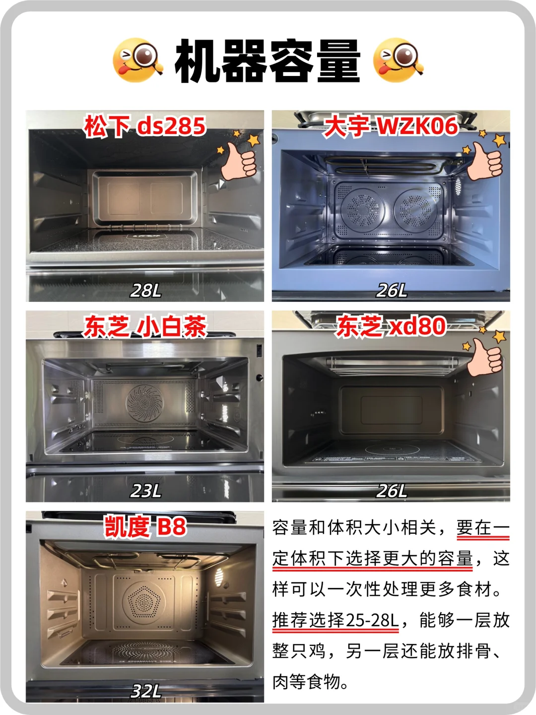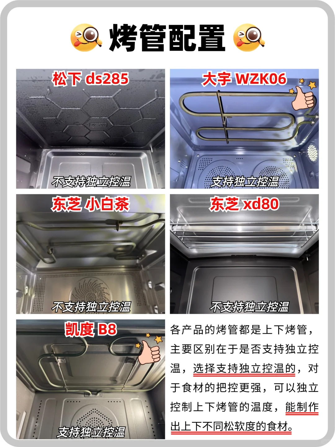 除了大宇,这次还测了其他4款热门型号,所有详细测评都在图里,涵盖了容量、内胆材质、支持功能、热风、蒸汽、烤管、微波配置等各方面。各项参数的重要性也做了科普,帮你理清选购思路!