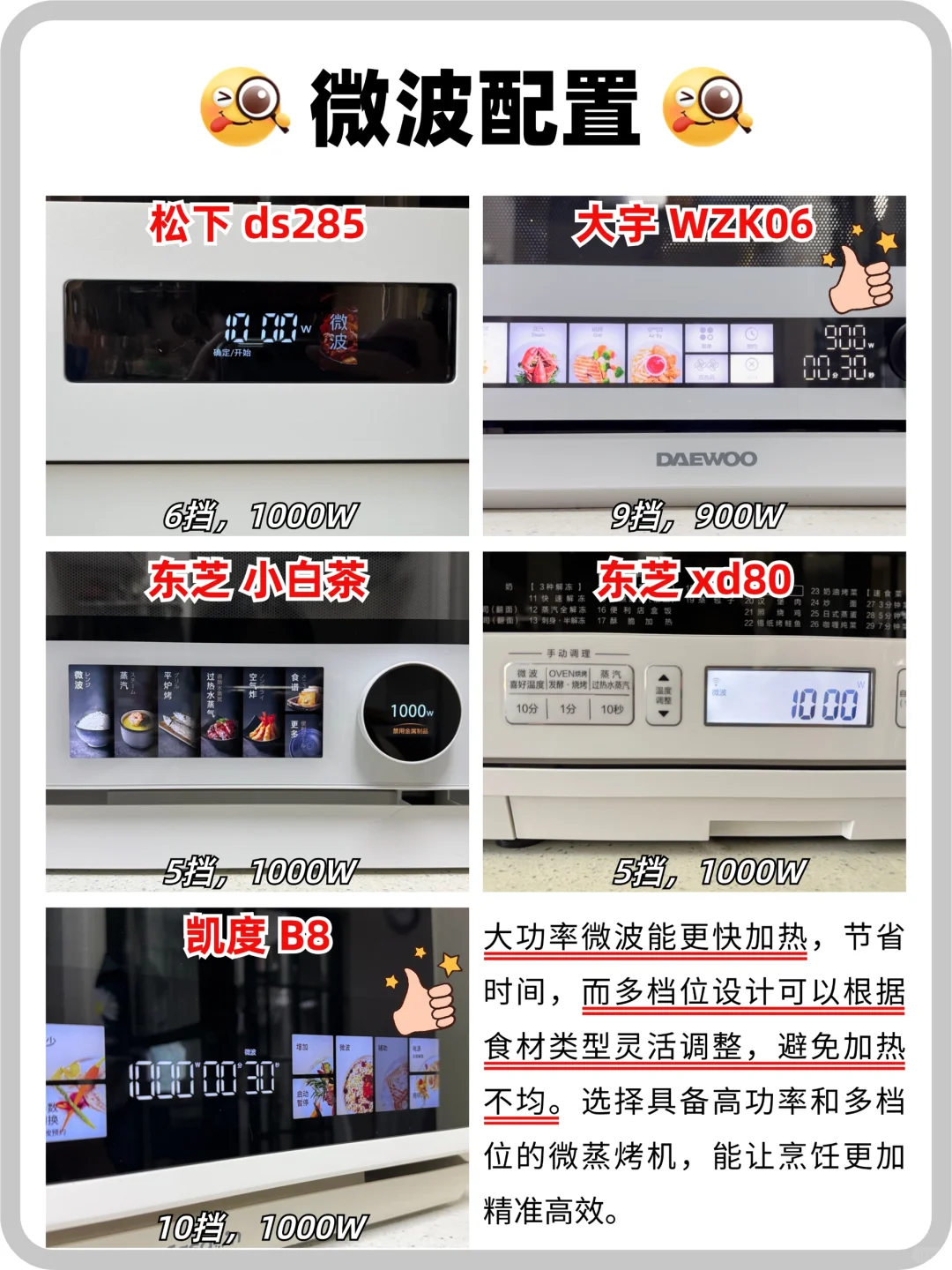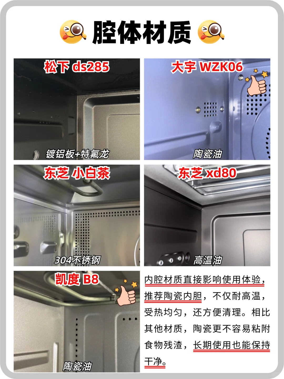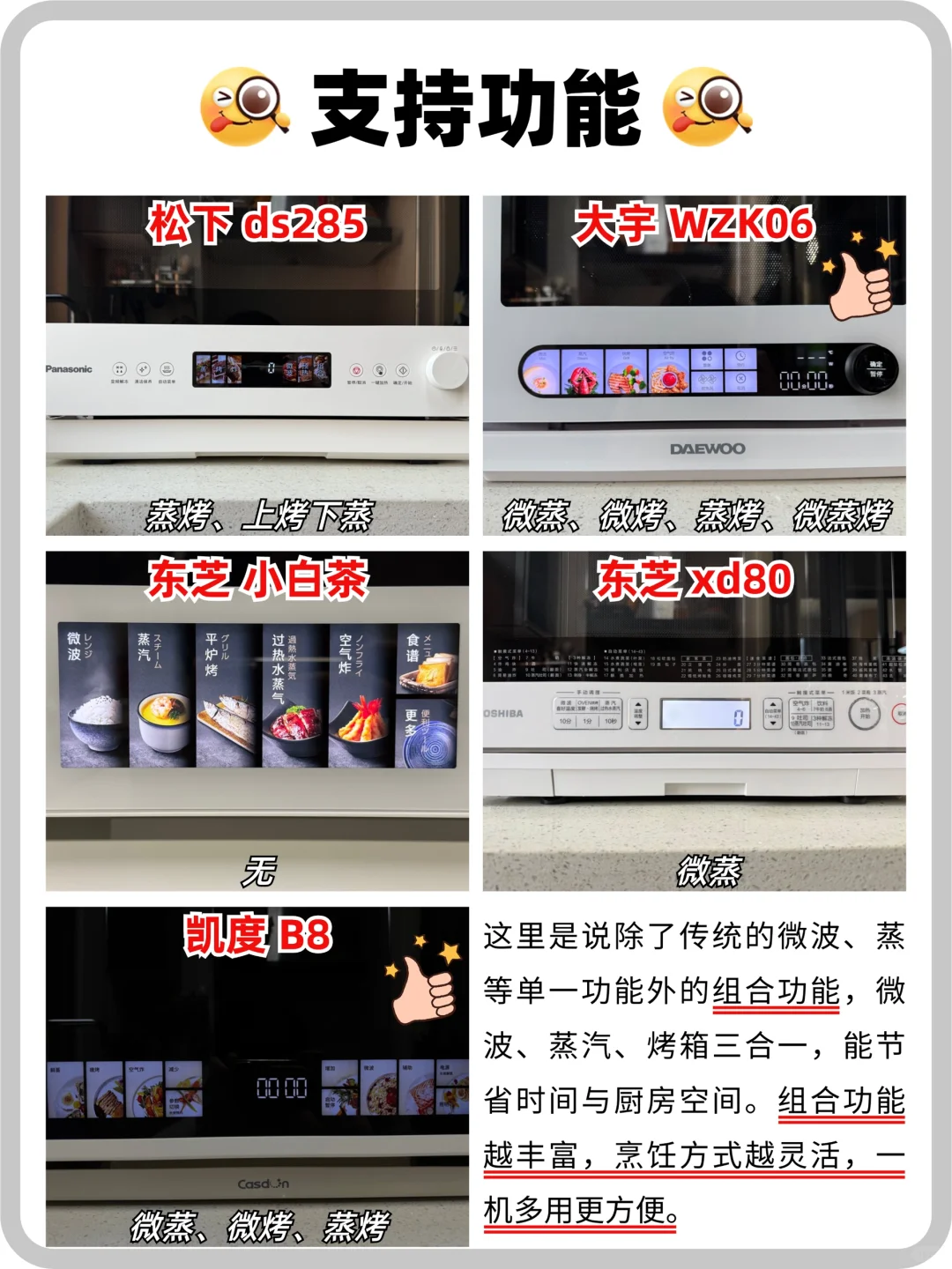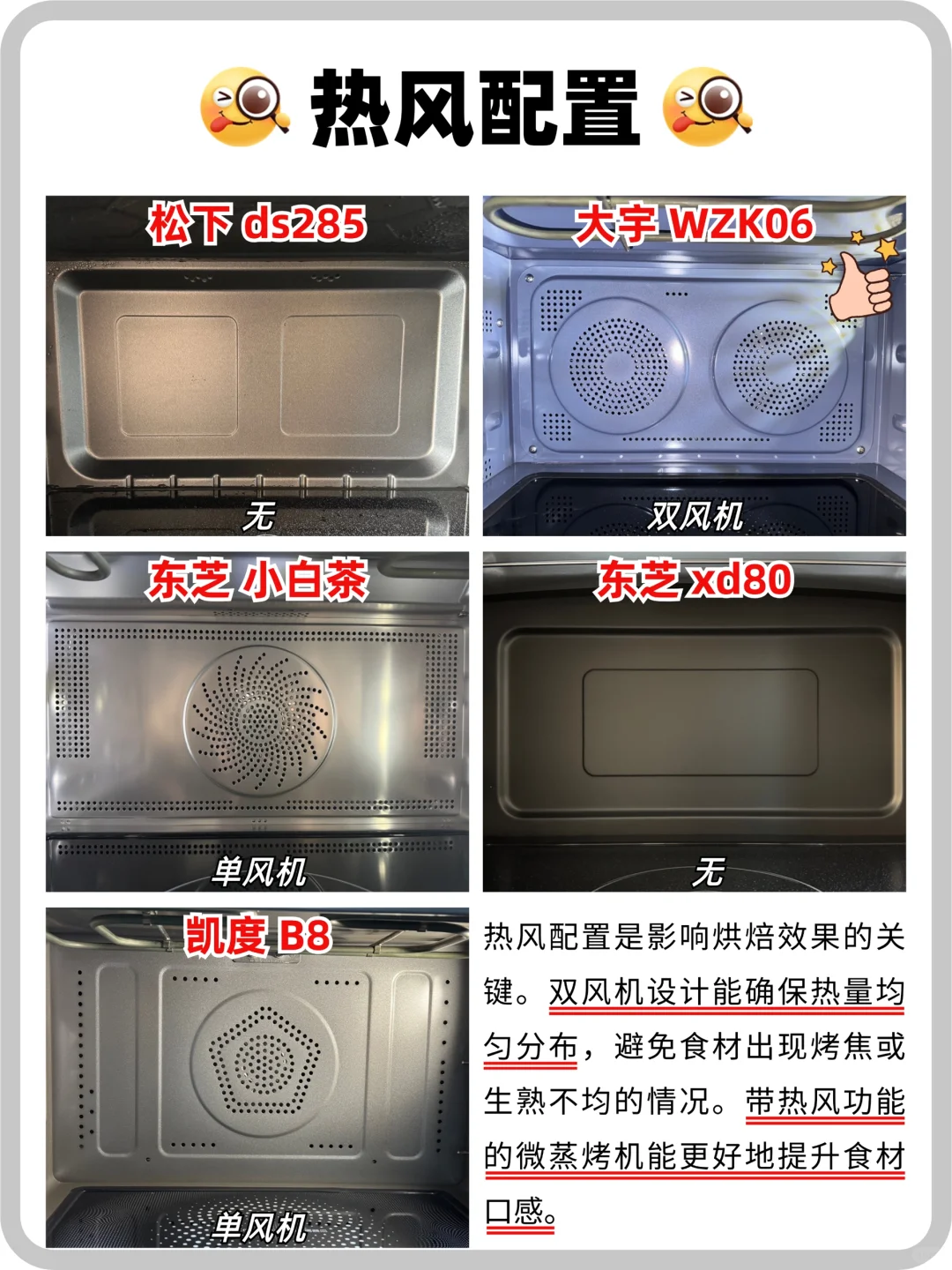 除了大宇,这次还测了其他4款热门型号,所有详细测评都在图里,涵盖了容量、内胆材质、支持功能、热风、蒸汽、烤管、微波配置等各方面。各项参数的重要性也做了科普,帮你理清选购思路!
